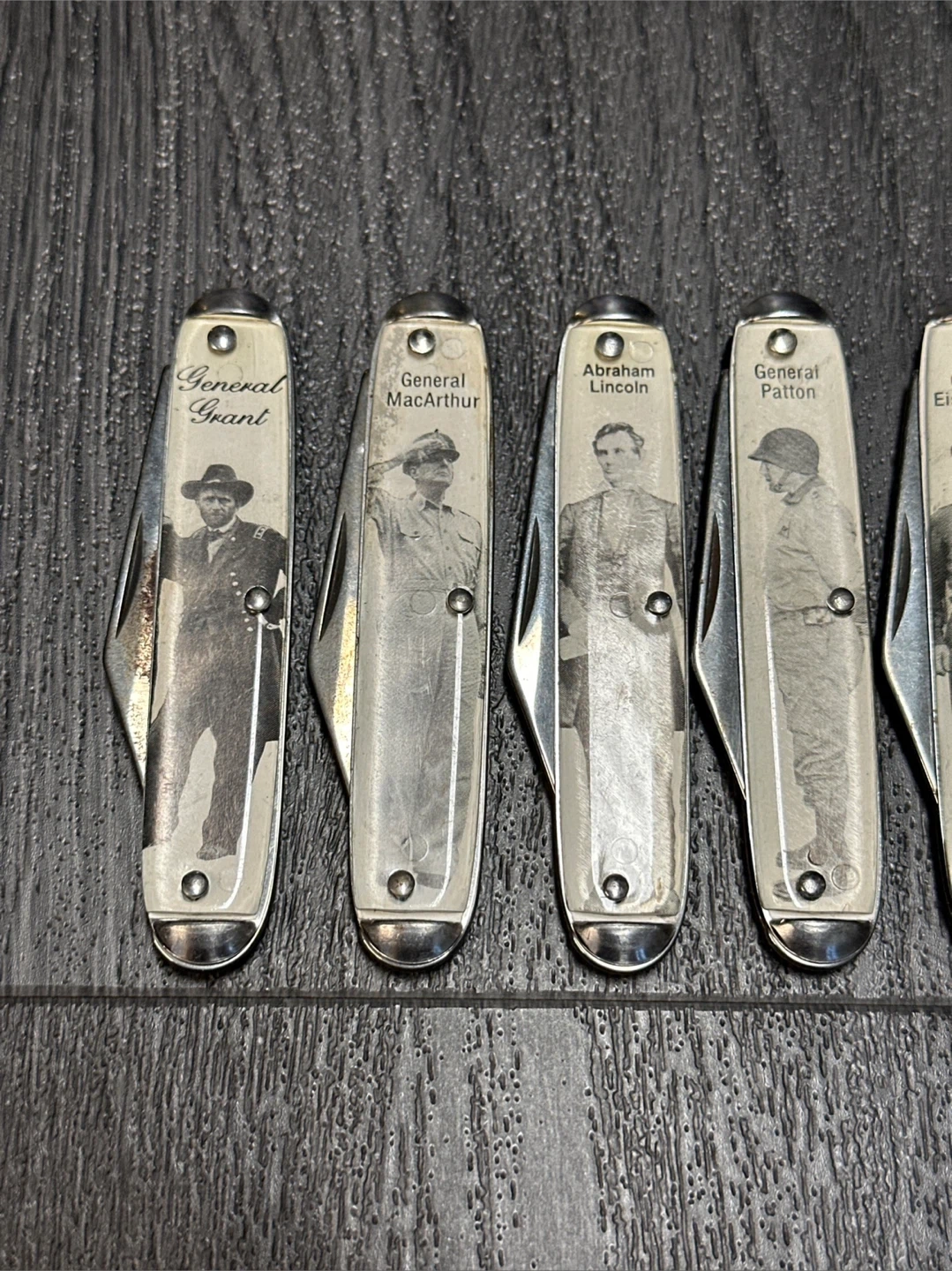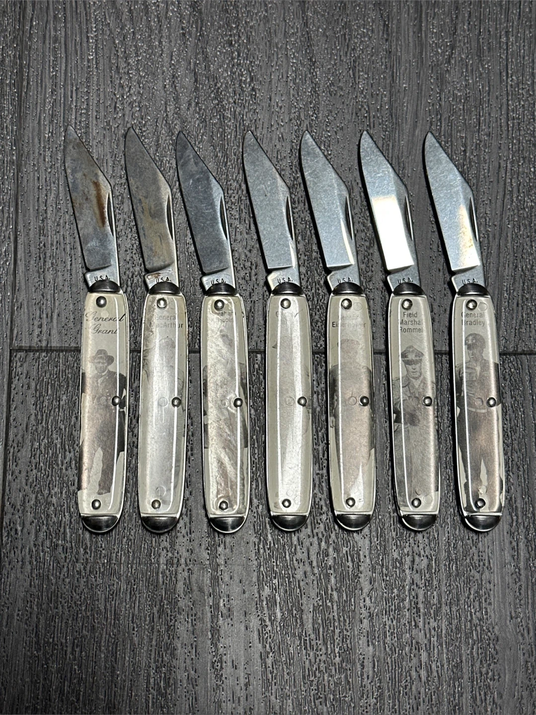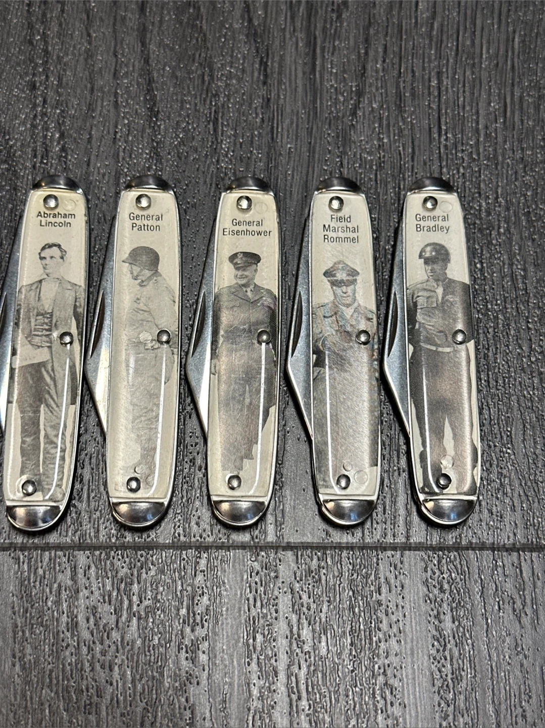 This set includes seven collectible pocket knives, each featuring an image and name of a historical military or political figure. Figures depicted include General Grant, General MacArthur, Abraham Lincoln, General Patton, General Eisenhower, Field Marshal Rommel, and General Bradley. These knives are made with metal blades and decorative handles. The set is for sale for $195, please feel free to send offer and I will consider interesting trades.