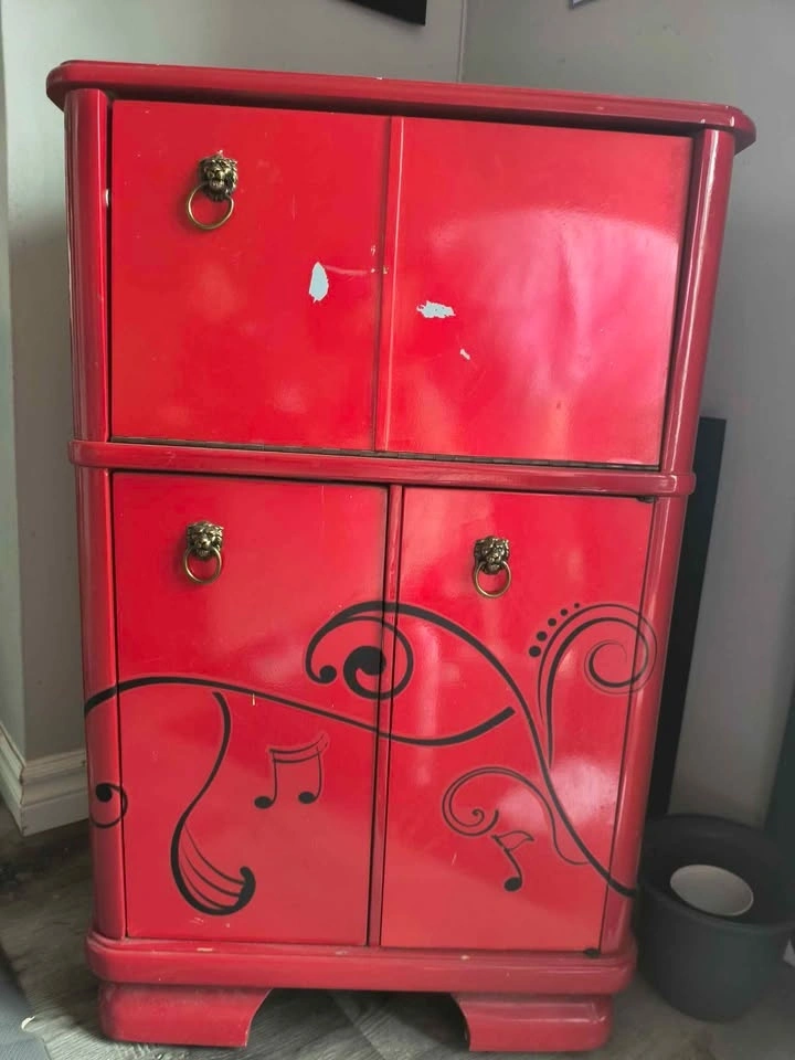 Previous owner added musical notes and swirls design on lower doors. I've taken the top ones off. It started peeling so I stopped.