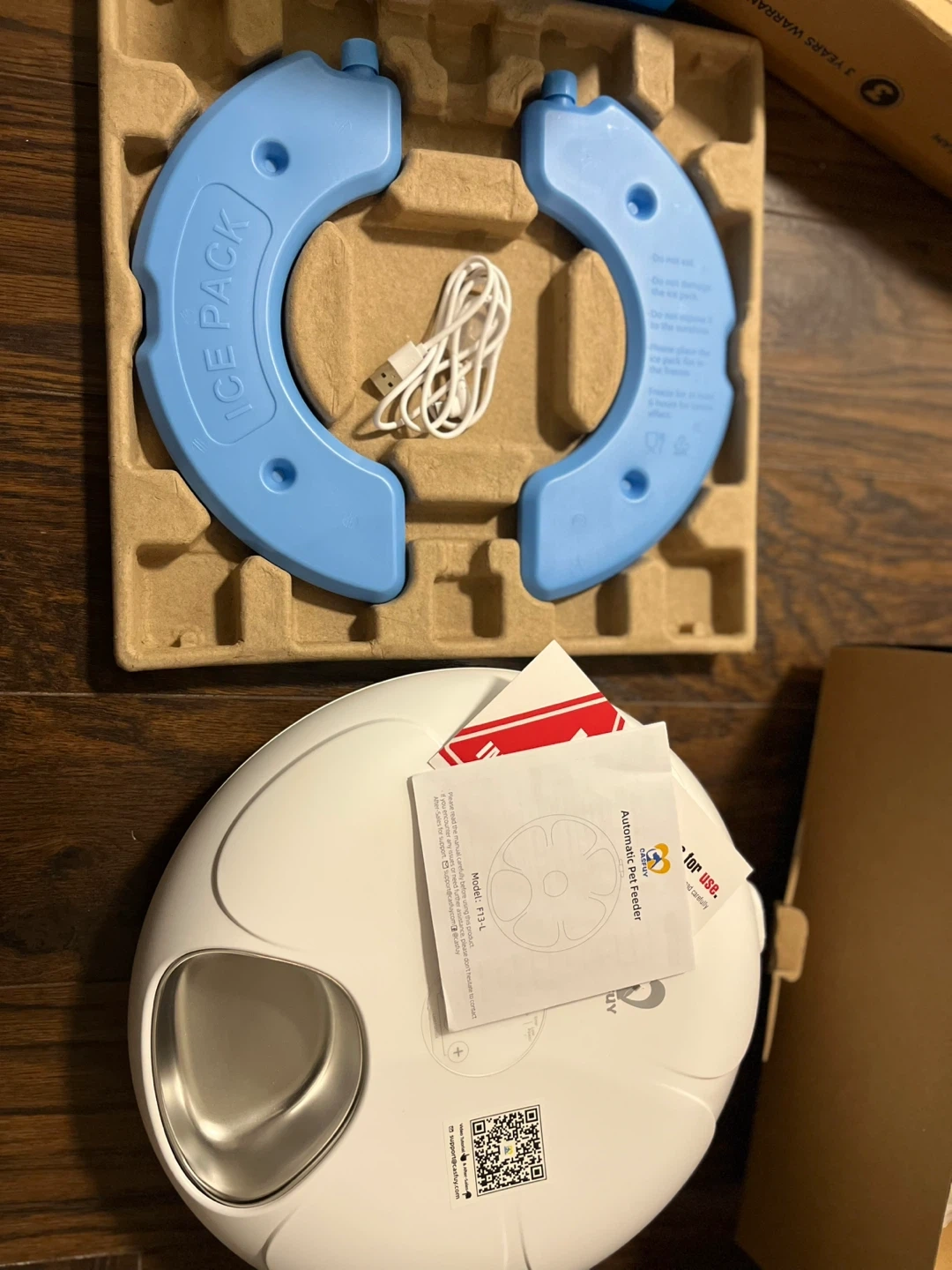 This is a CASFUY automatic pet feeder. It comes with two ice packs and a USB charging cable. The bowl is made of stainless steel. This feeder is ideal for keeping your pet's food fresh.