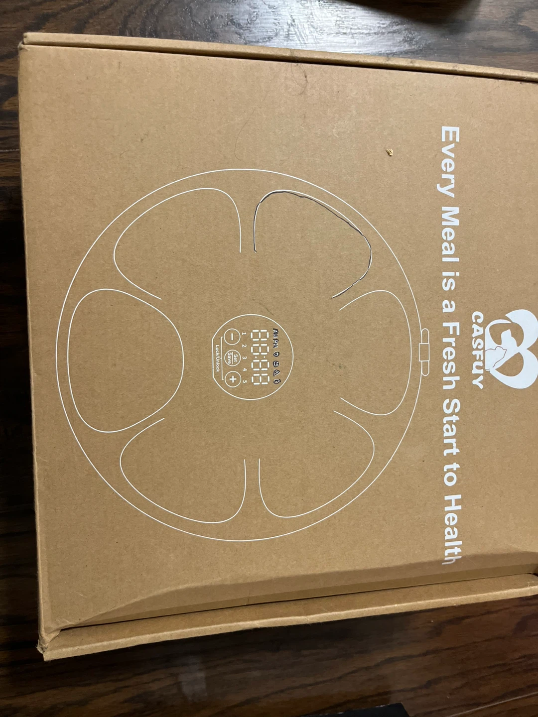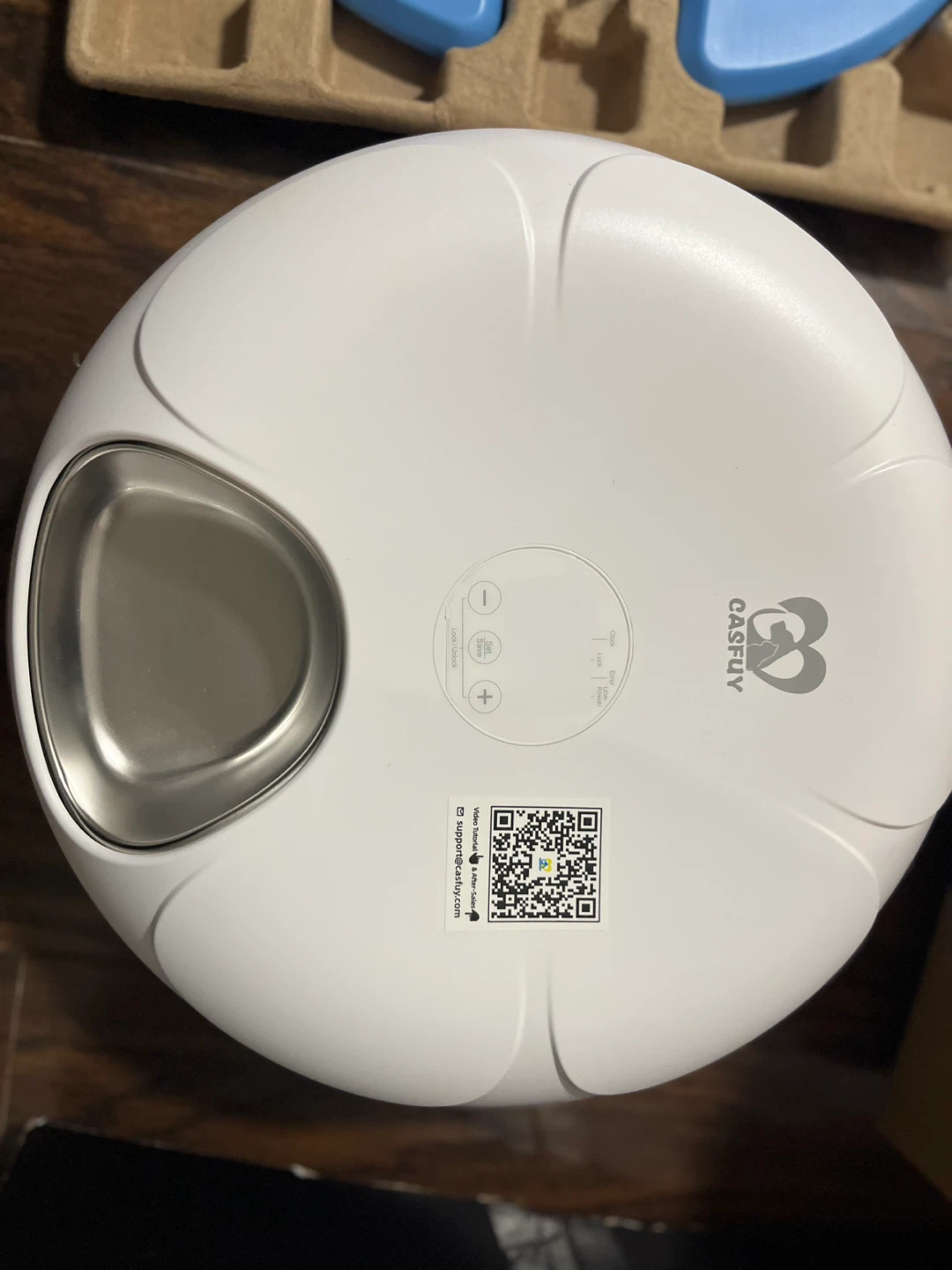This is a CASFUY automatic pet feeder. It comes with two ice packs and a USB charging cable. The bowl is made of stainless steel. This feeder is ideal for keeping your pet's food fresh.