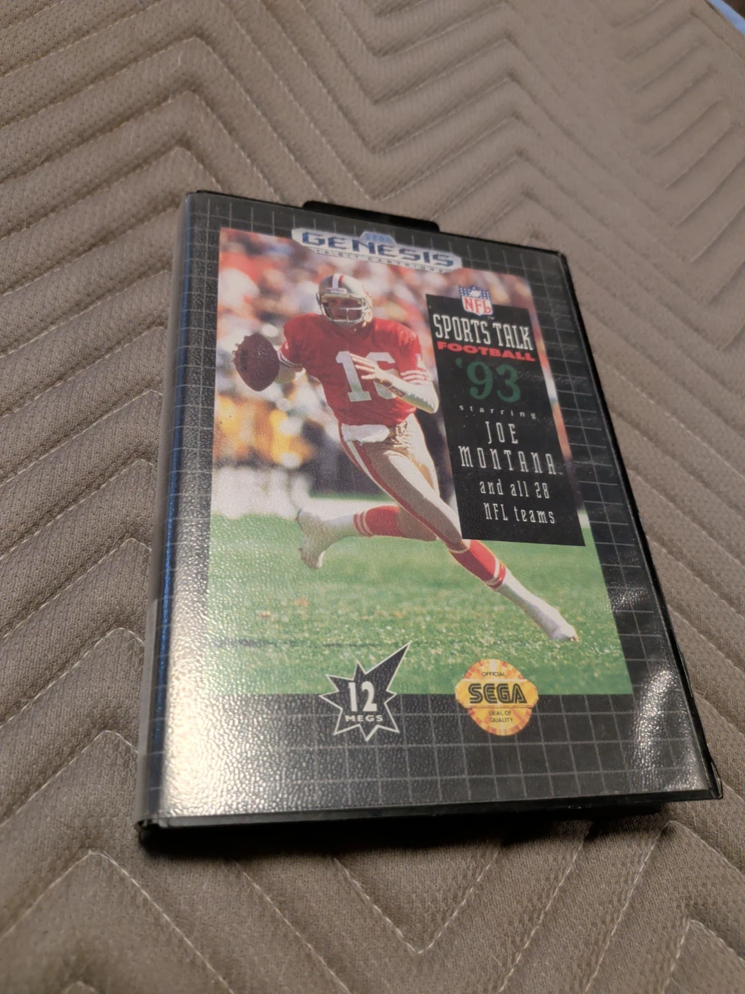 Sports Talk Football '93 for Sega Genesis. Features Joe Montana and all 28 NFL teams. Includes original case. A fun football game for Sega Genesis fans!