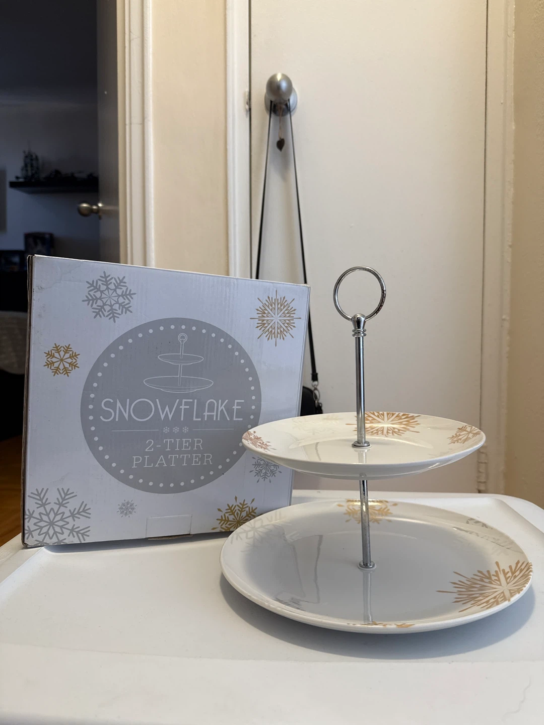This is a two-tier platter stand with a snowflake design. It comes with the original box. Great for serving snacks or desserts!
