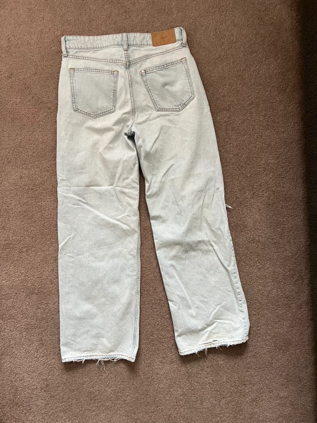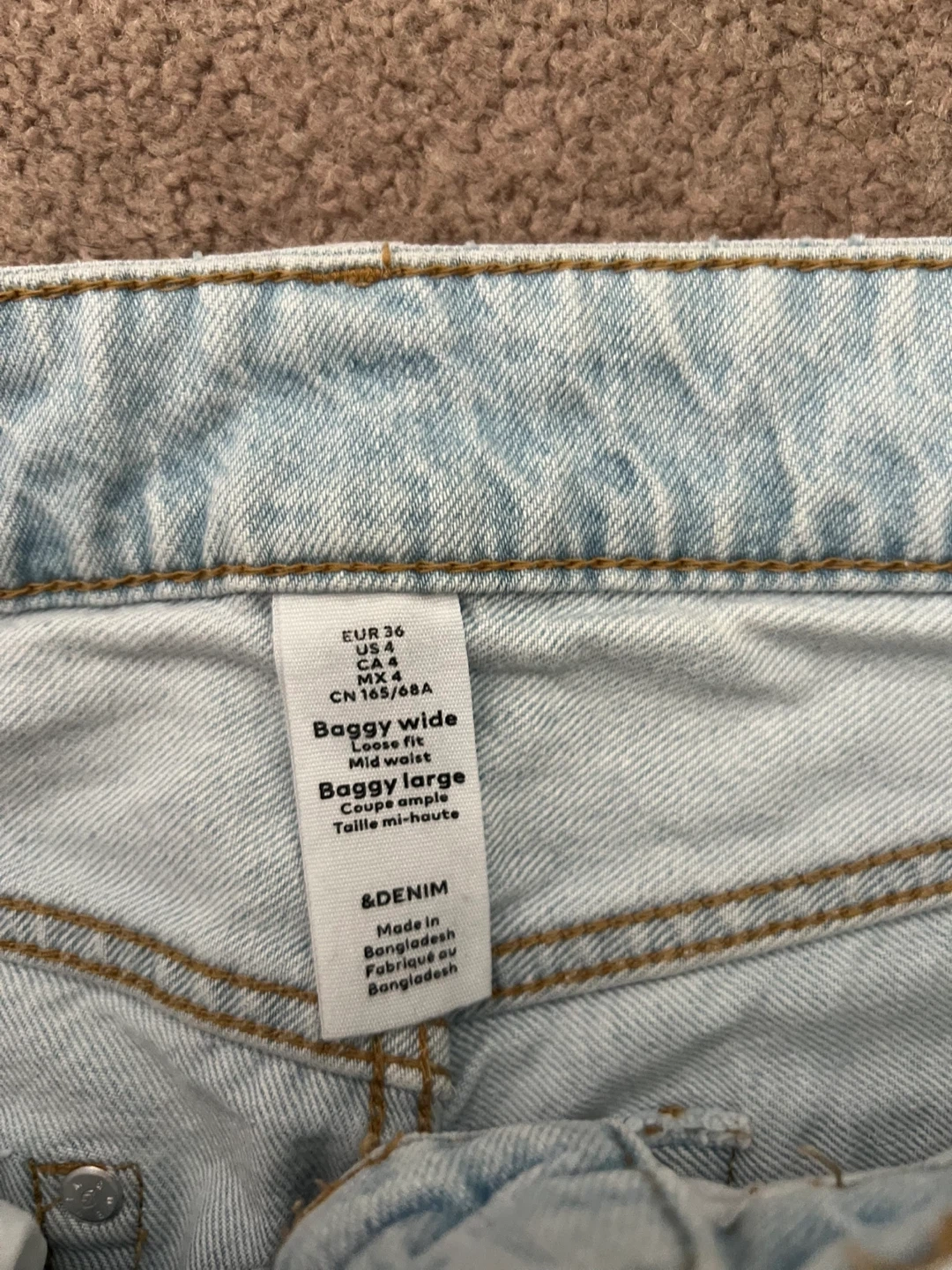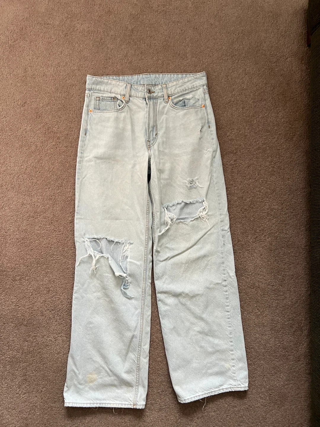 Selling a pair of H&M Baggy Wide jeans in size US 4. They have a loose fit and a mid-waist. These jeans have a distressed look with rips and tears, giving them a cool, casual vibe!