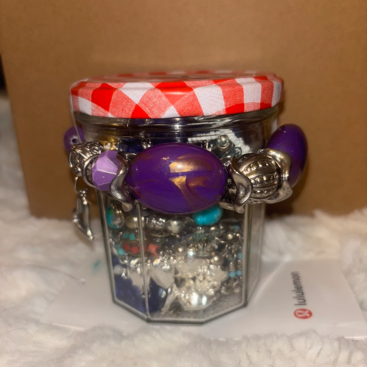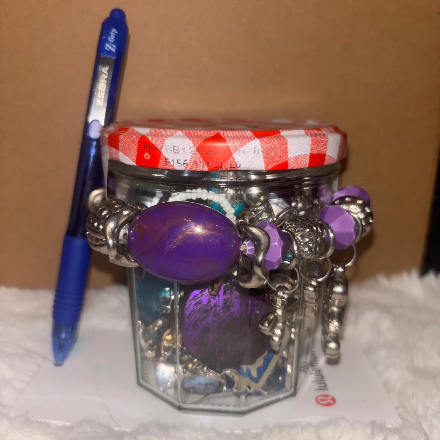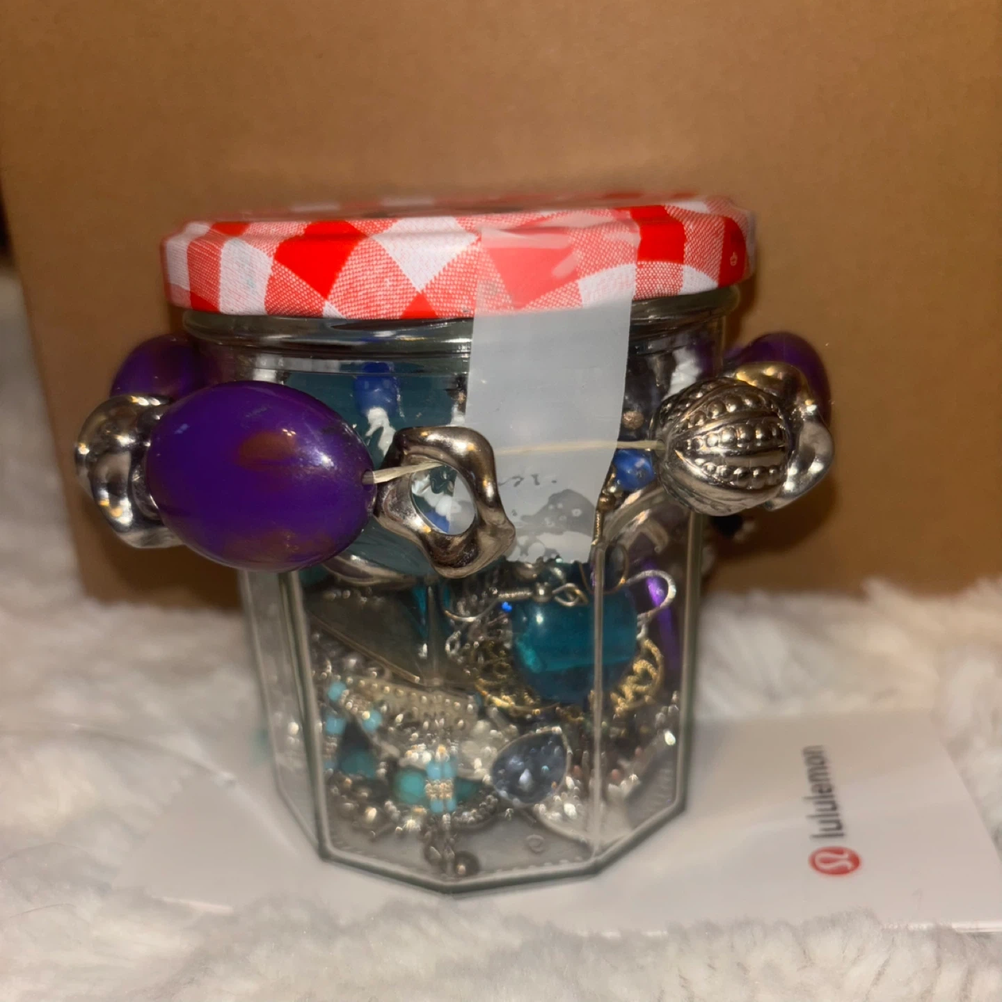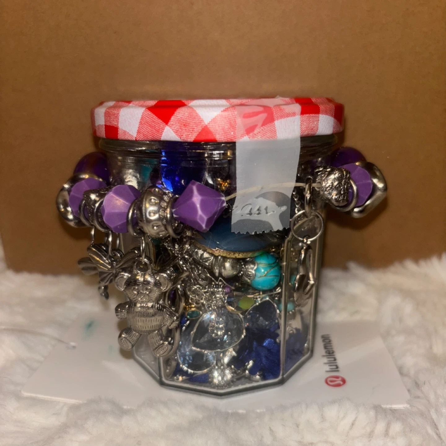 Selling a jar filled with blue jewelry. There is a variety of necklaces, bracelets, and charms inside. Perfect for anyone who loves to accessorize! Blue themed.