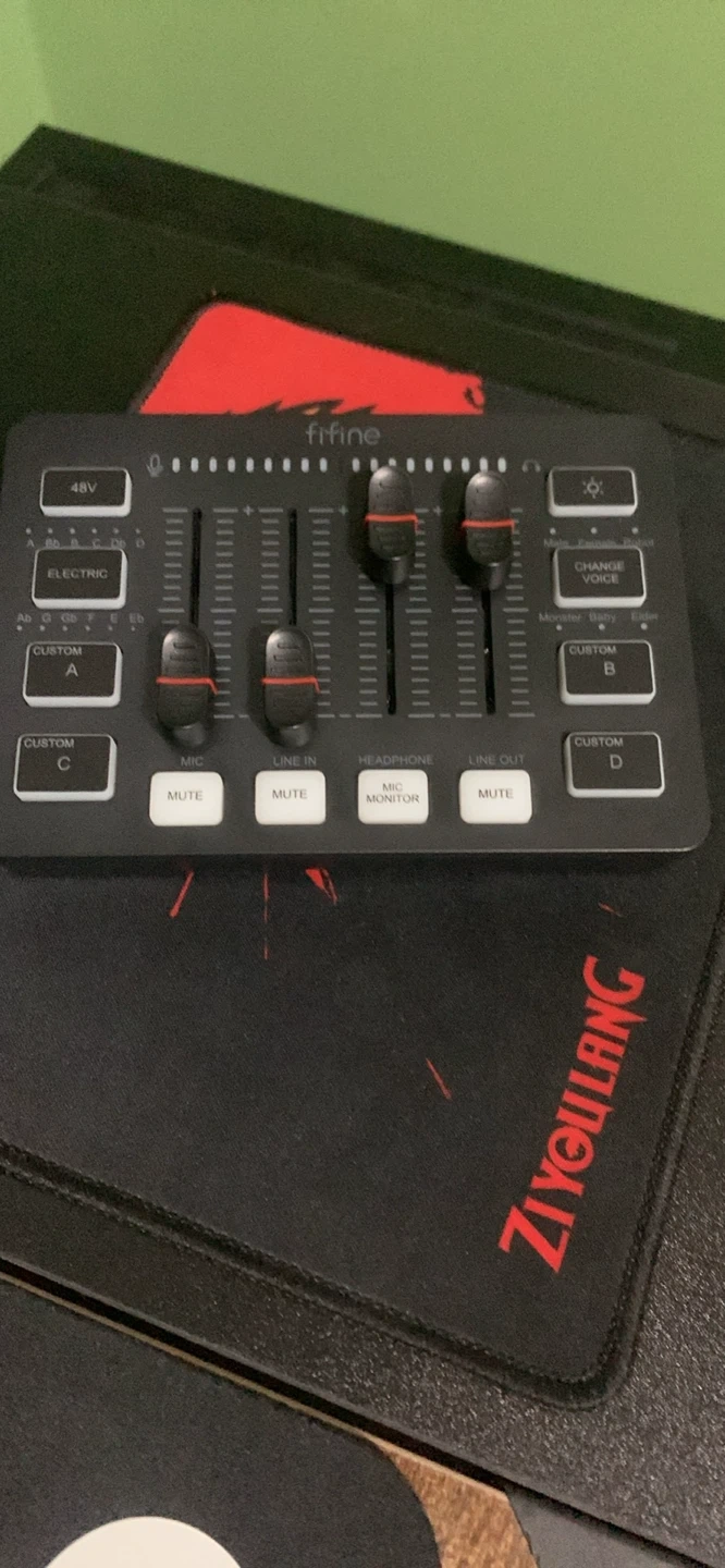 This is a Fifine audio mixer. It features custom buttons for mic, line in, and line out. Includes headphone monitoring and mute functions. Perfect for streamers and podcasters needing enhanced audio control!