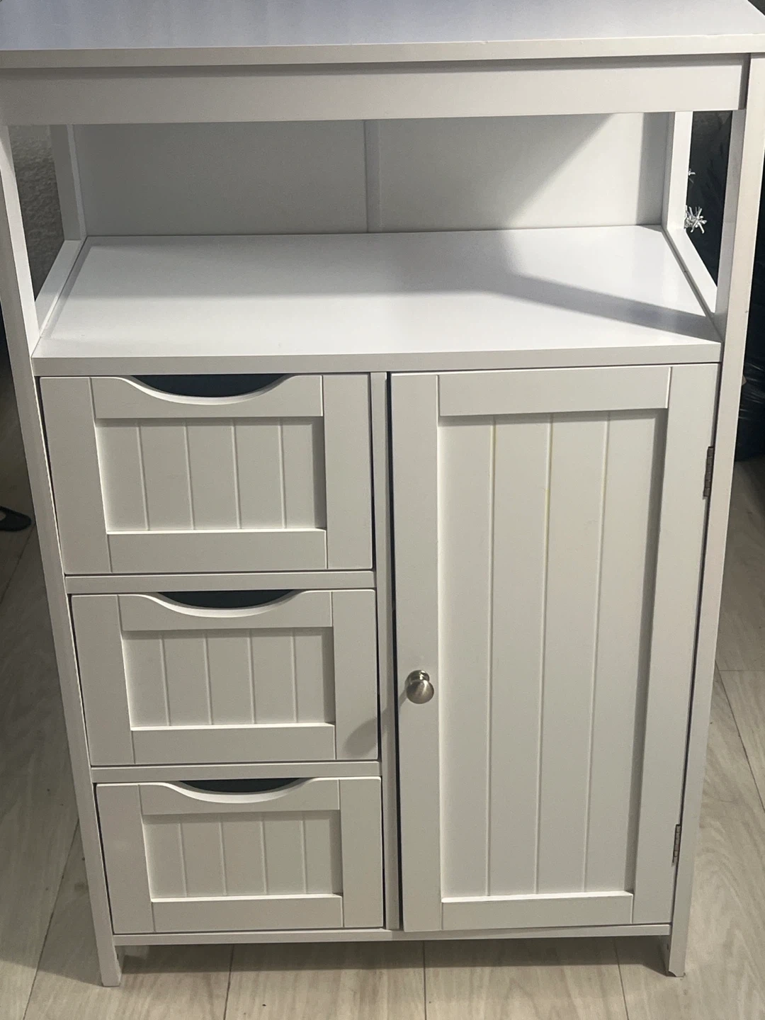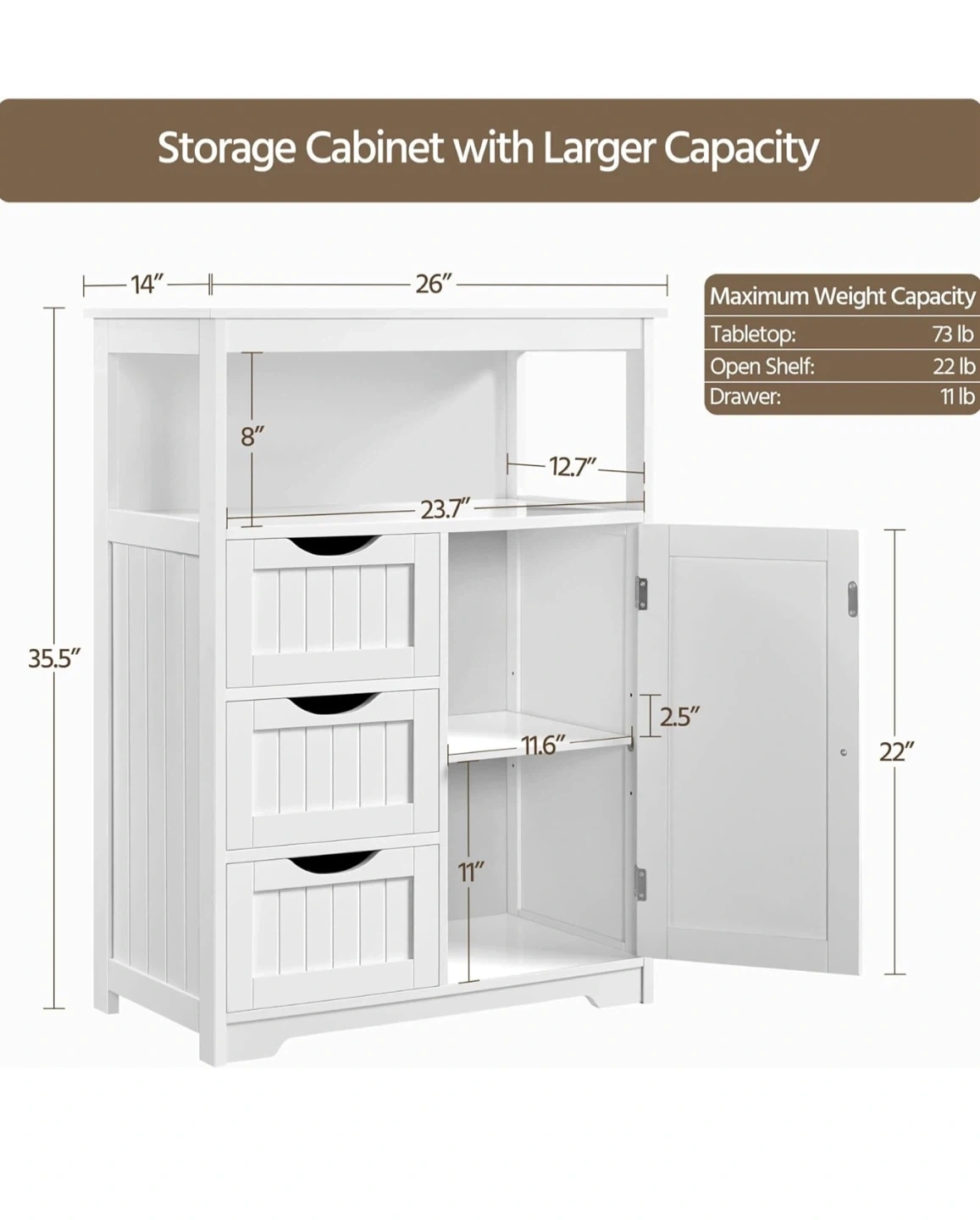 White storage cabinet with three drawers and a cabinet door. It has open shelving above the drawers. This unit offers plenty of storage space for various items. It's a functional piece for organizing rooms.