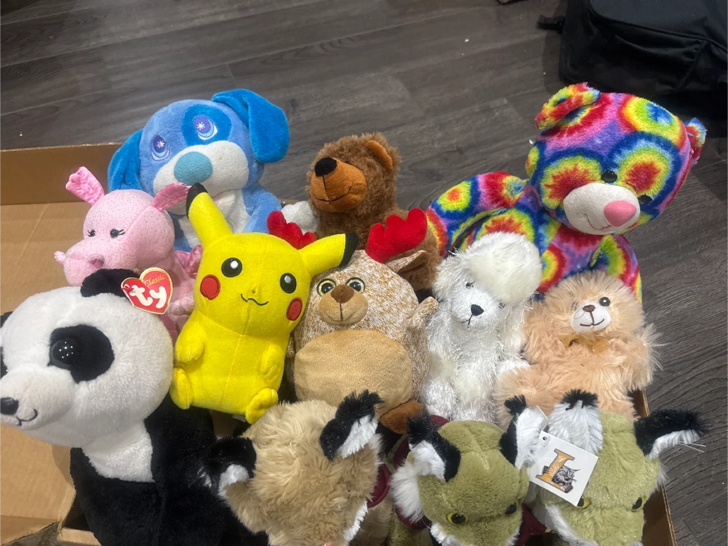 Selling a mixed lot of plush toys! There's a variety of cute characters including a panda, Pikachu, and several different bears. Perfect for kids or collectors!