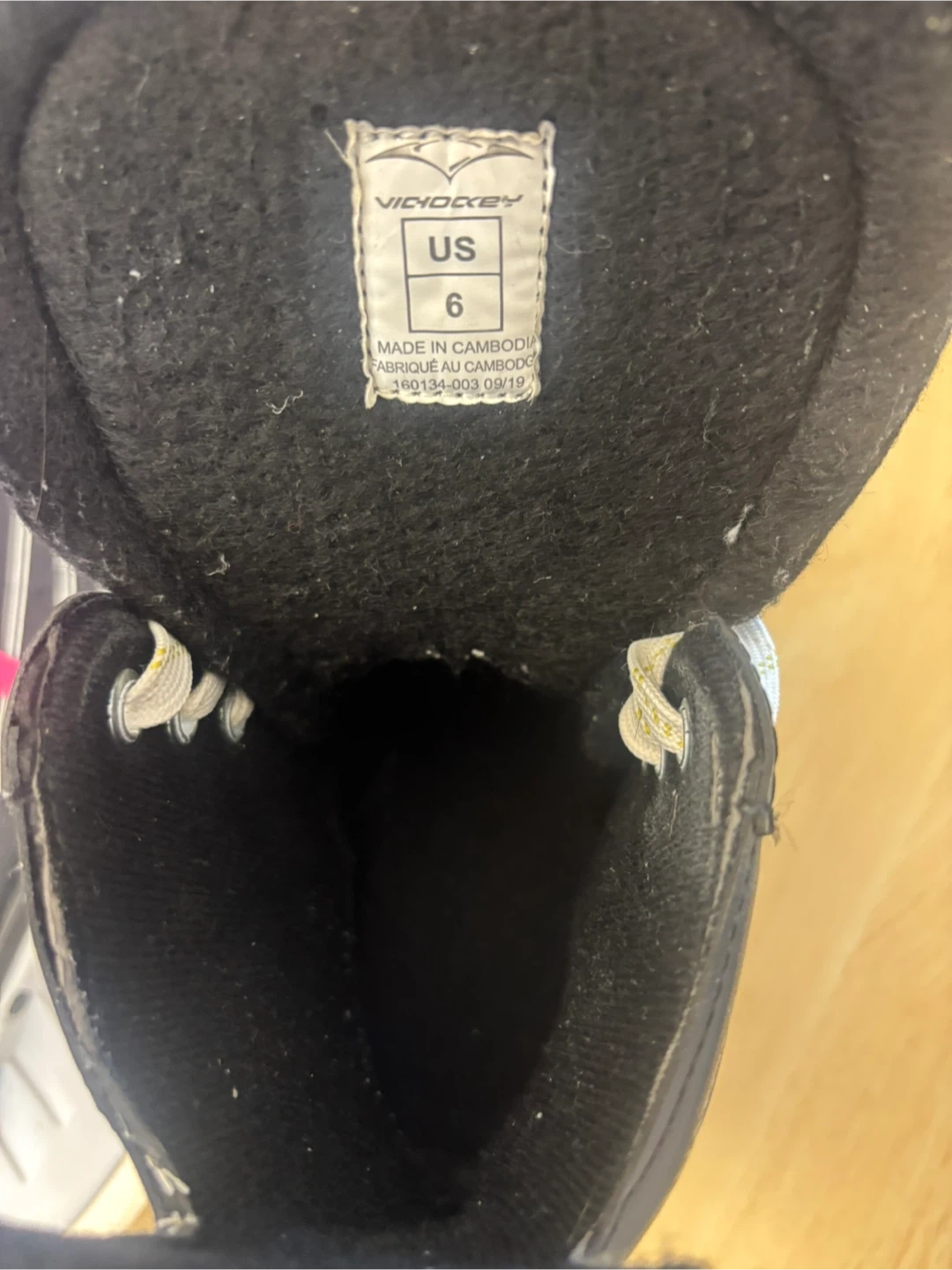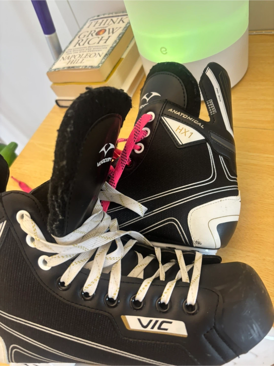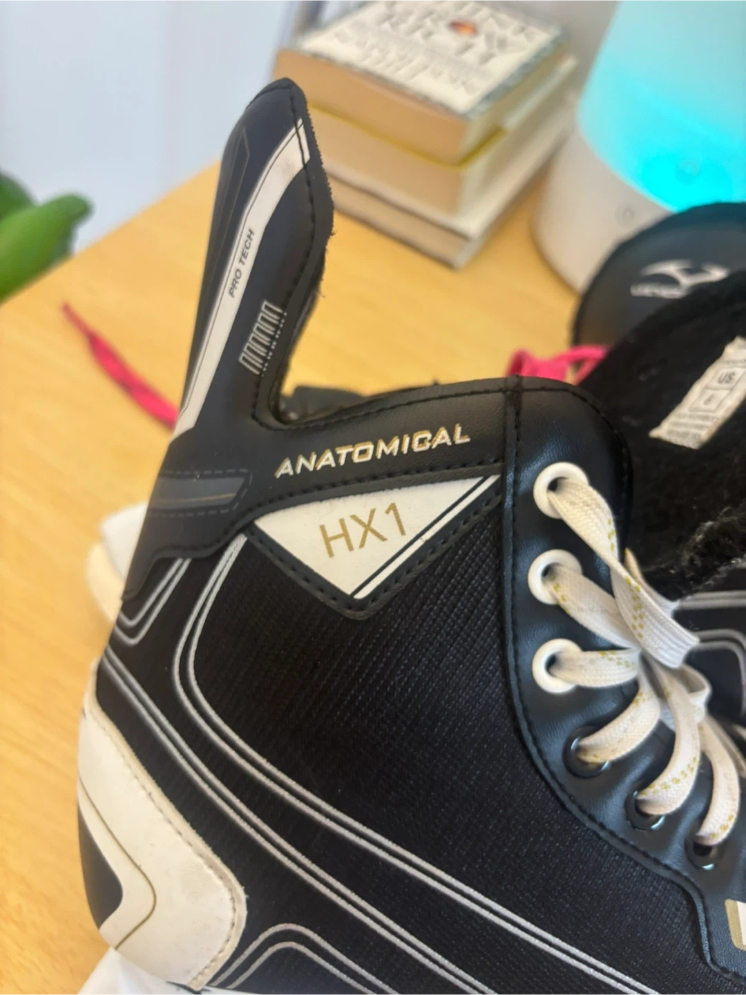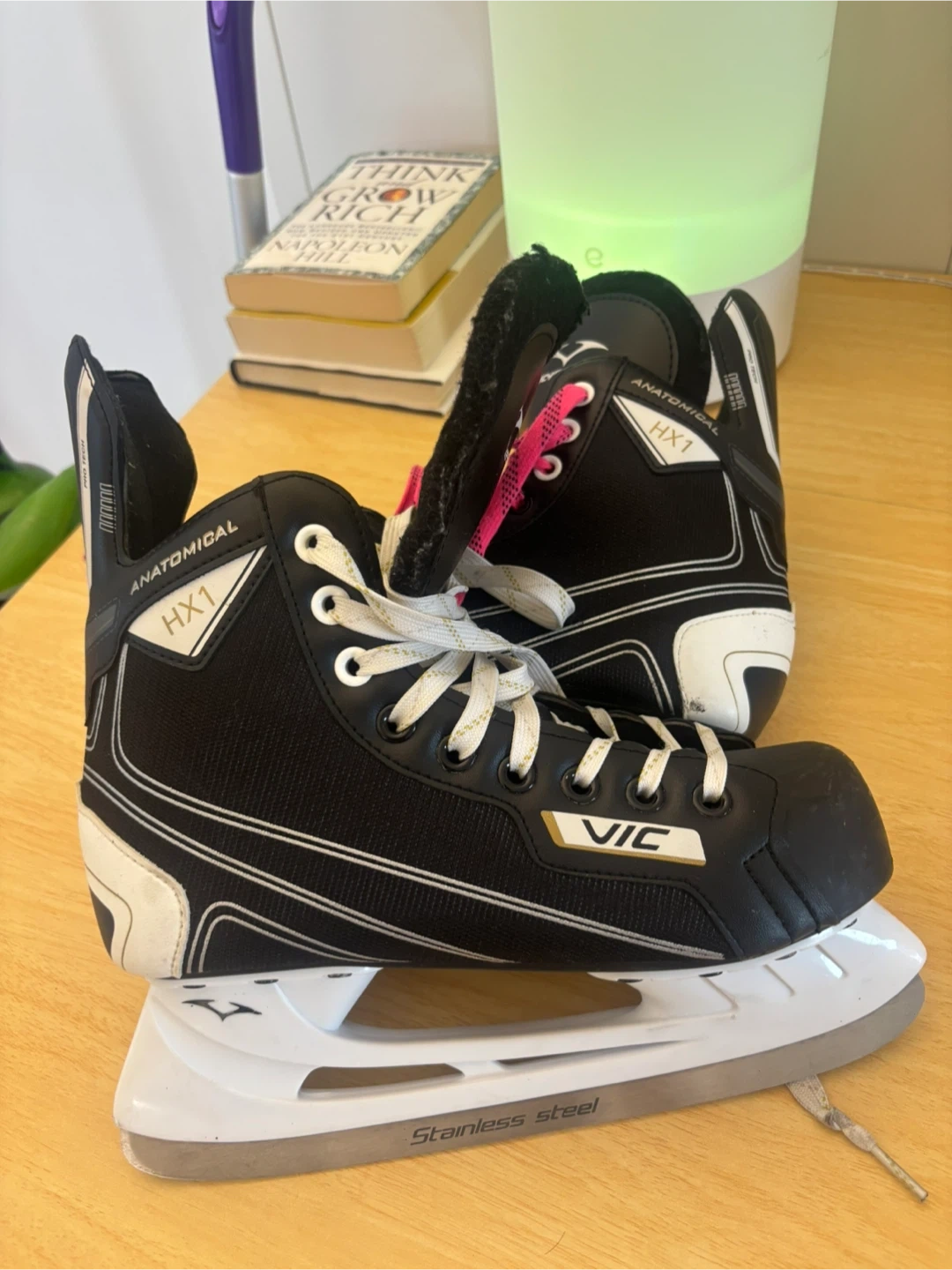Vaughn HX1 anatomical hockey skates. Black and white design with pink laces included. Made in Cambodia. US size 6.