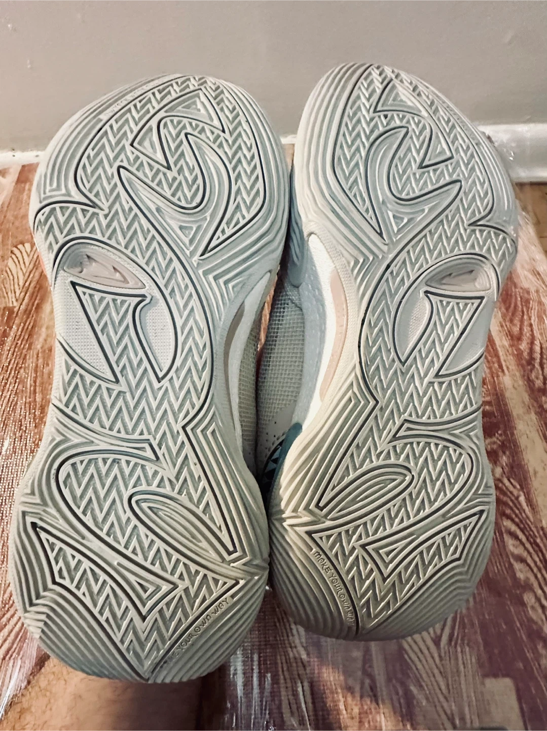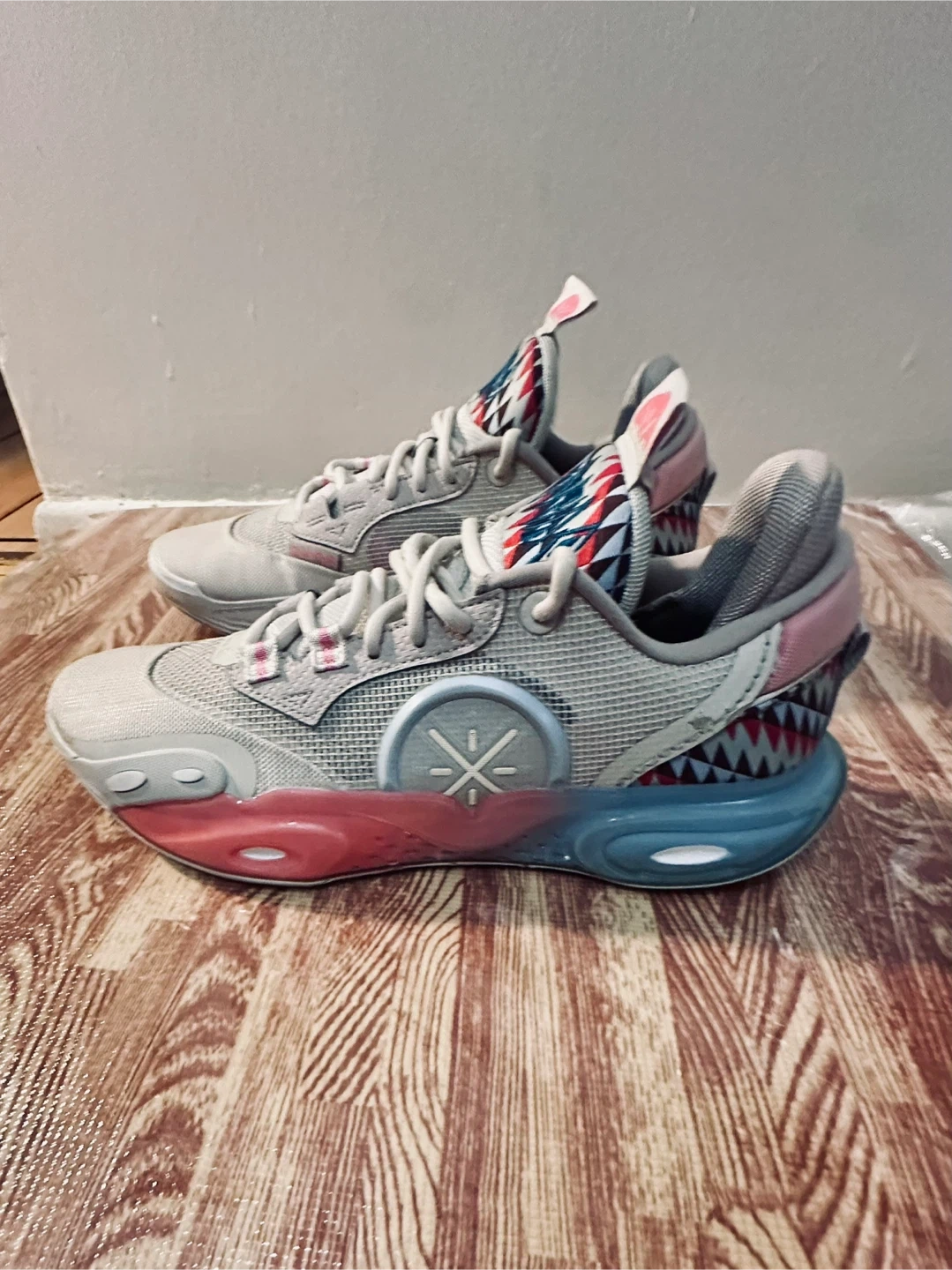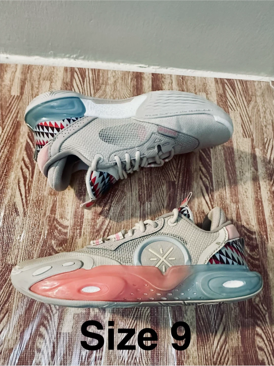 These Li-Ning Way of Wade All City 9 V2 basketball shoes are a size 9. They feature a grey mesh upper with a unique shark-tooth inspired design on the heel and midsole accents in pink and blue. The outsole provides excellent traction.