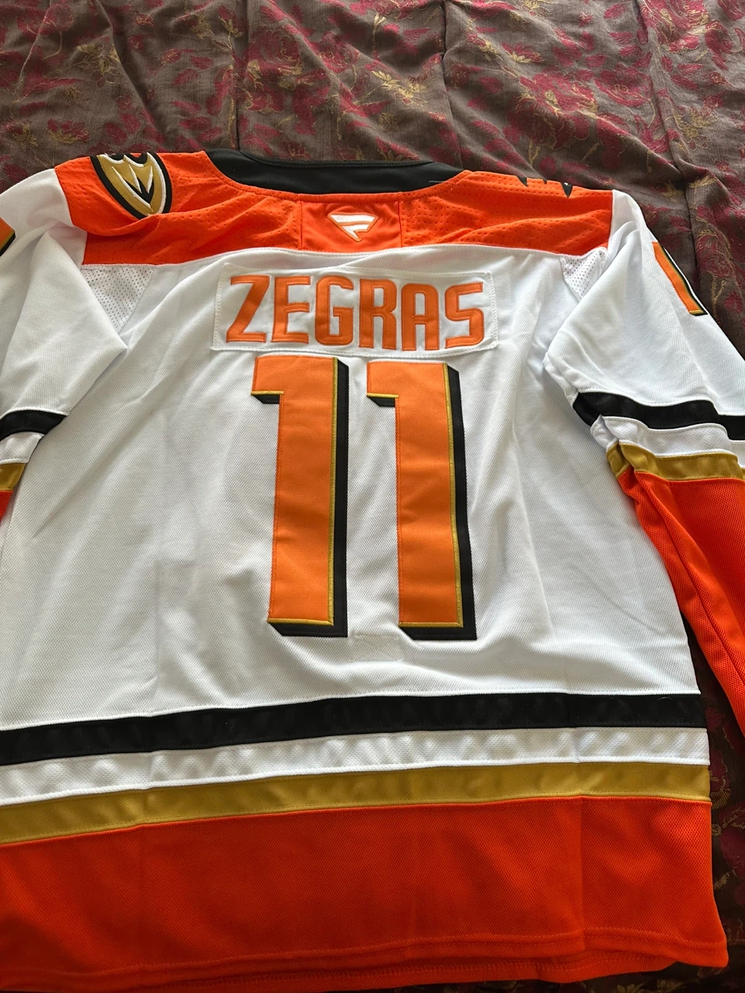 This is a replica hockey jersey for the Anaheim Ducks, featuring "ZEGRAS" and the number "11" on the back. It's the team's white home colourway with orange and black accents. This jersey is great for any Ducks fan!