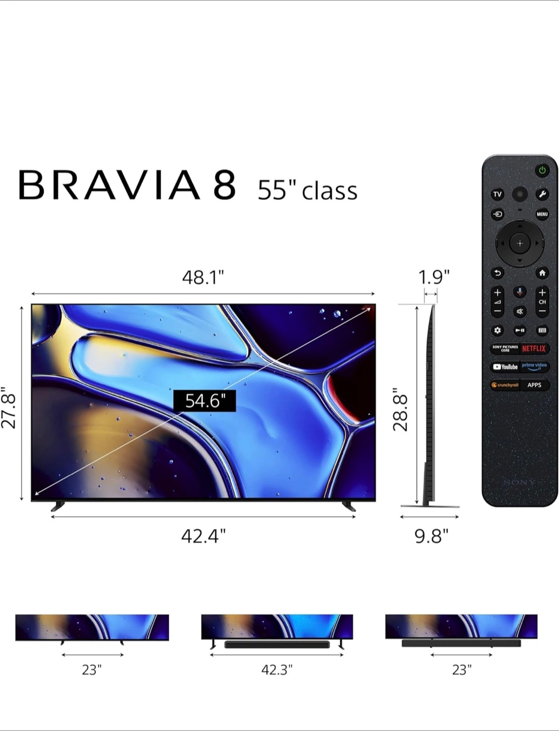 55-inch class OLED smart TV. Dolby Vision and Atmos. Includes remote. Excellent picture quality. Sleek design.