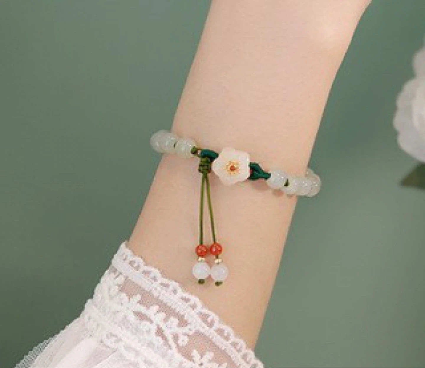 This is a beautiful jade bracelet. It features a delicate design with green jade beads and red accents. Perfect for adding a touch of elegance to any outfit!