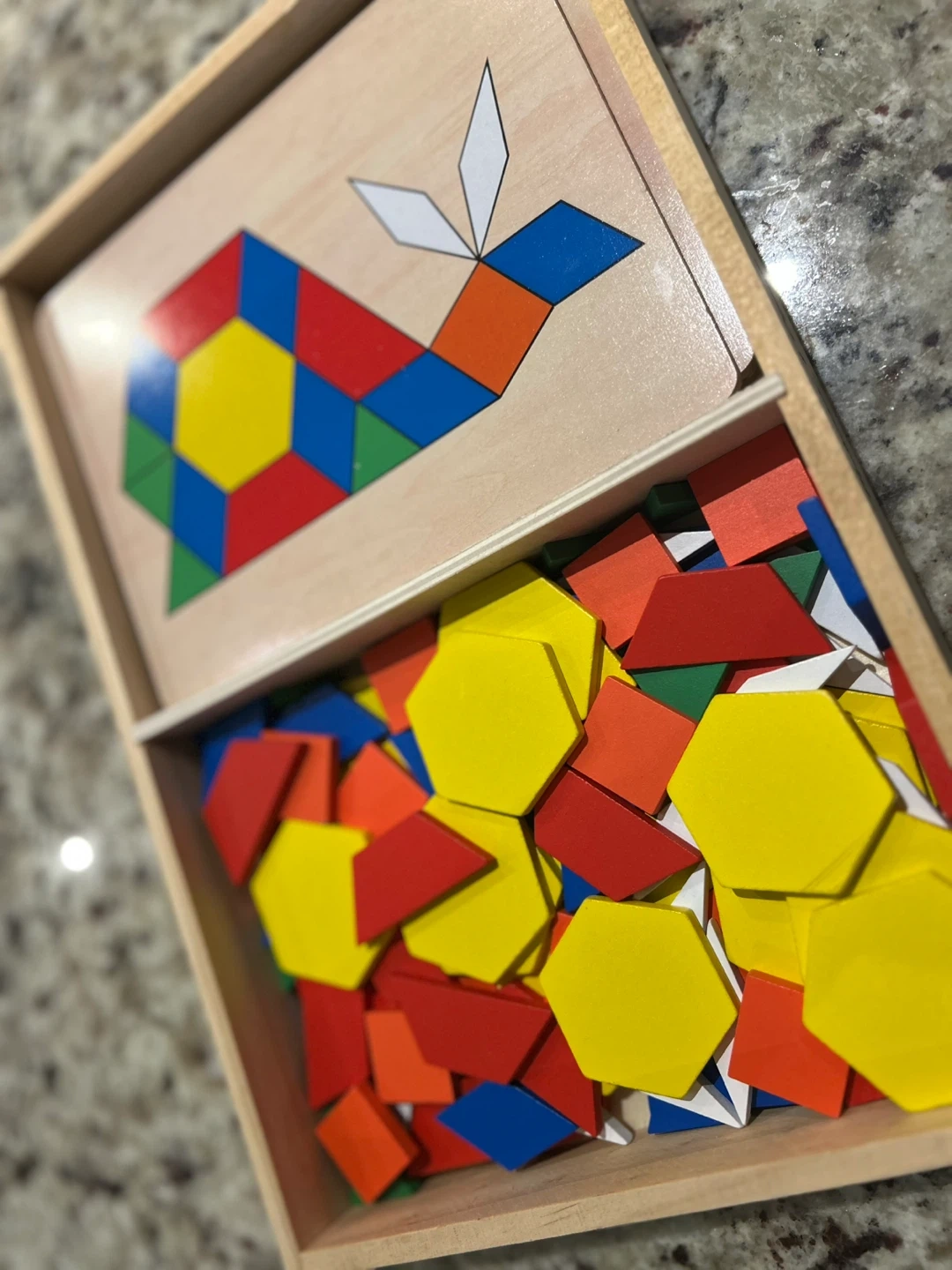 Wooden set with colourful geometric shapes for creating patterns. Includes pattern cards and a wooden storage box.