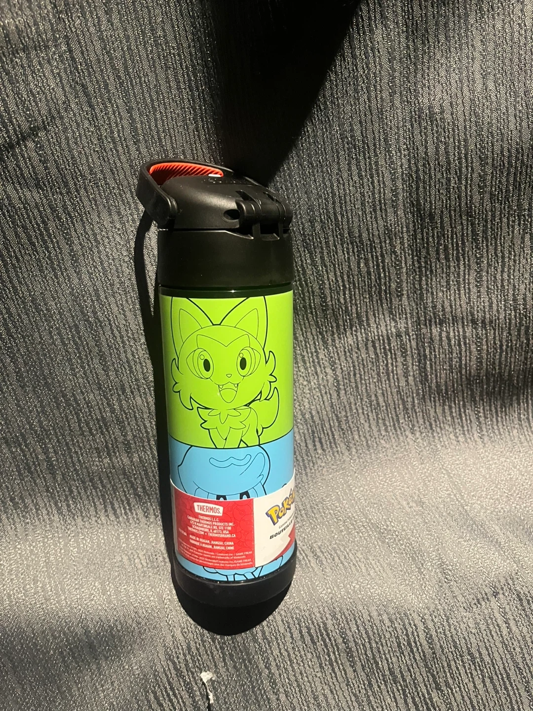 This is a Thermos brand water bottle featuring Pikachu from Pokemon. It has a flip-top lid for easy drinking. Made for kids, it's great for school or playtime!