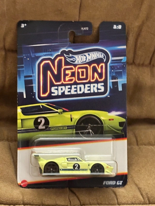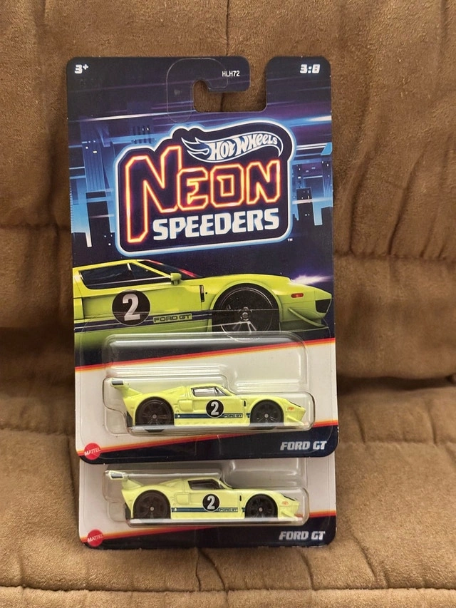 Add this striking Hot Wheels Ford GT from the Neon Speeders series to your collection! This collectible die-cast car features vibrant neon colours and meticulous detailing. It's in new condition, still sealed in its original packaging, making it a must-have for enthusiasts and collectors alike. Don't miss out on owning this beauty!