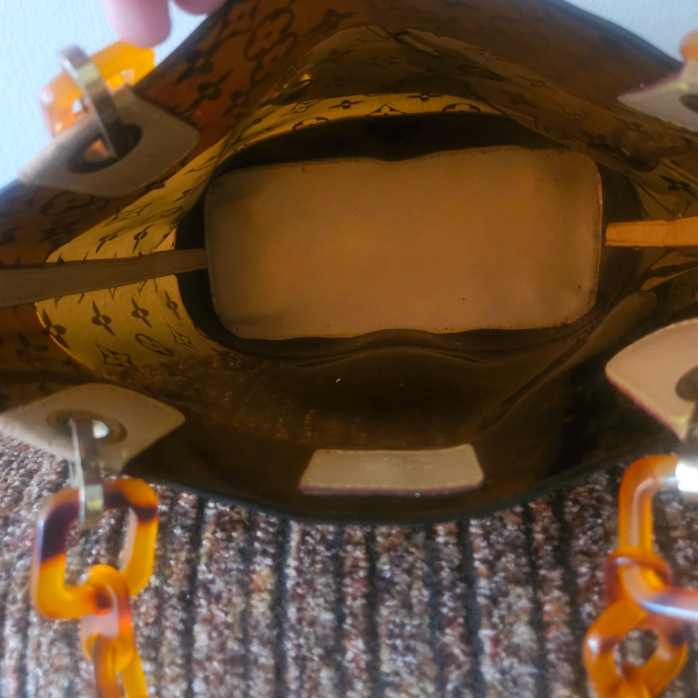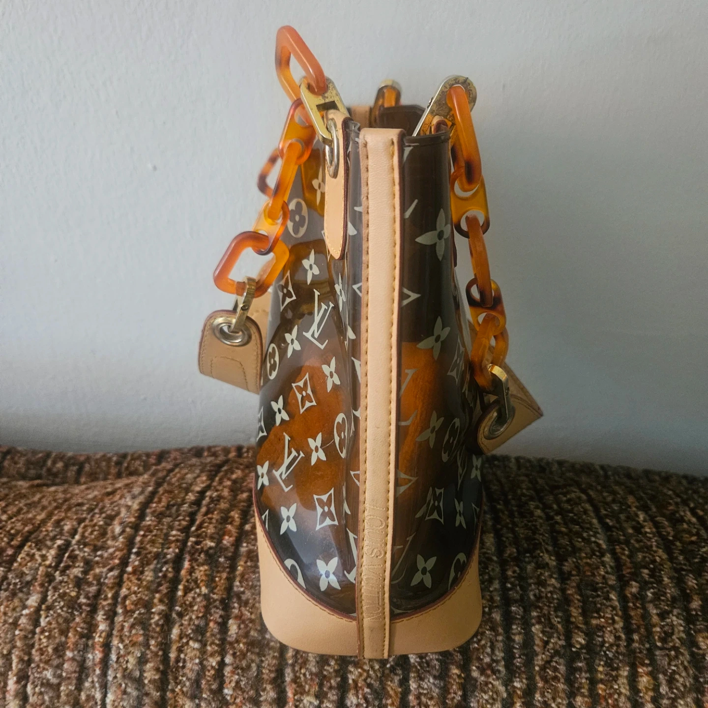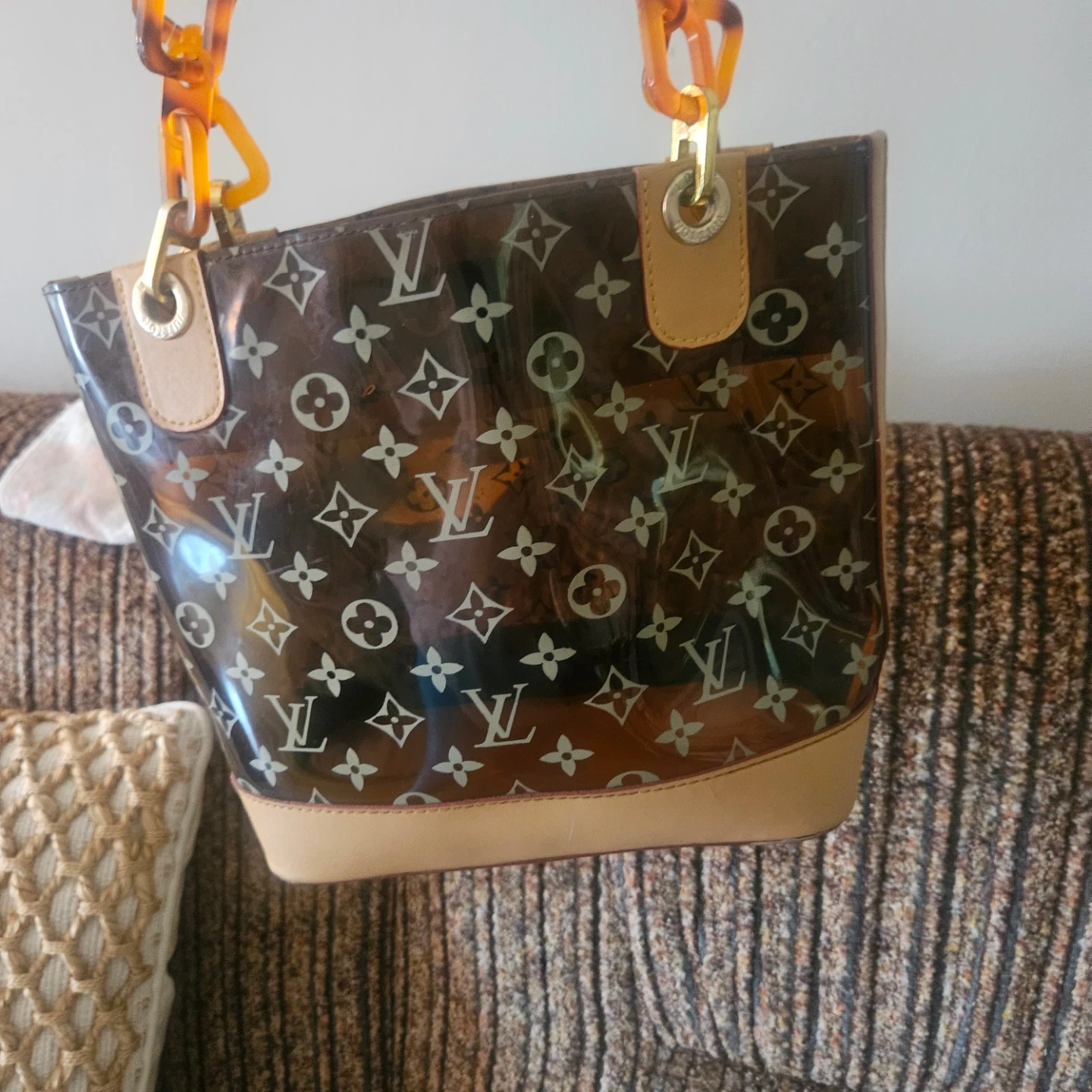 This Louis Vuitton tote bag features the iconic monogram pattern on a transparent PVC exterior. It has tan leather trim and tortoise shell style handles. Includes protective metal feet on the bottom.100% authentic hi