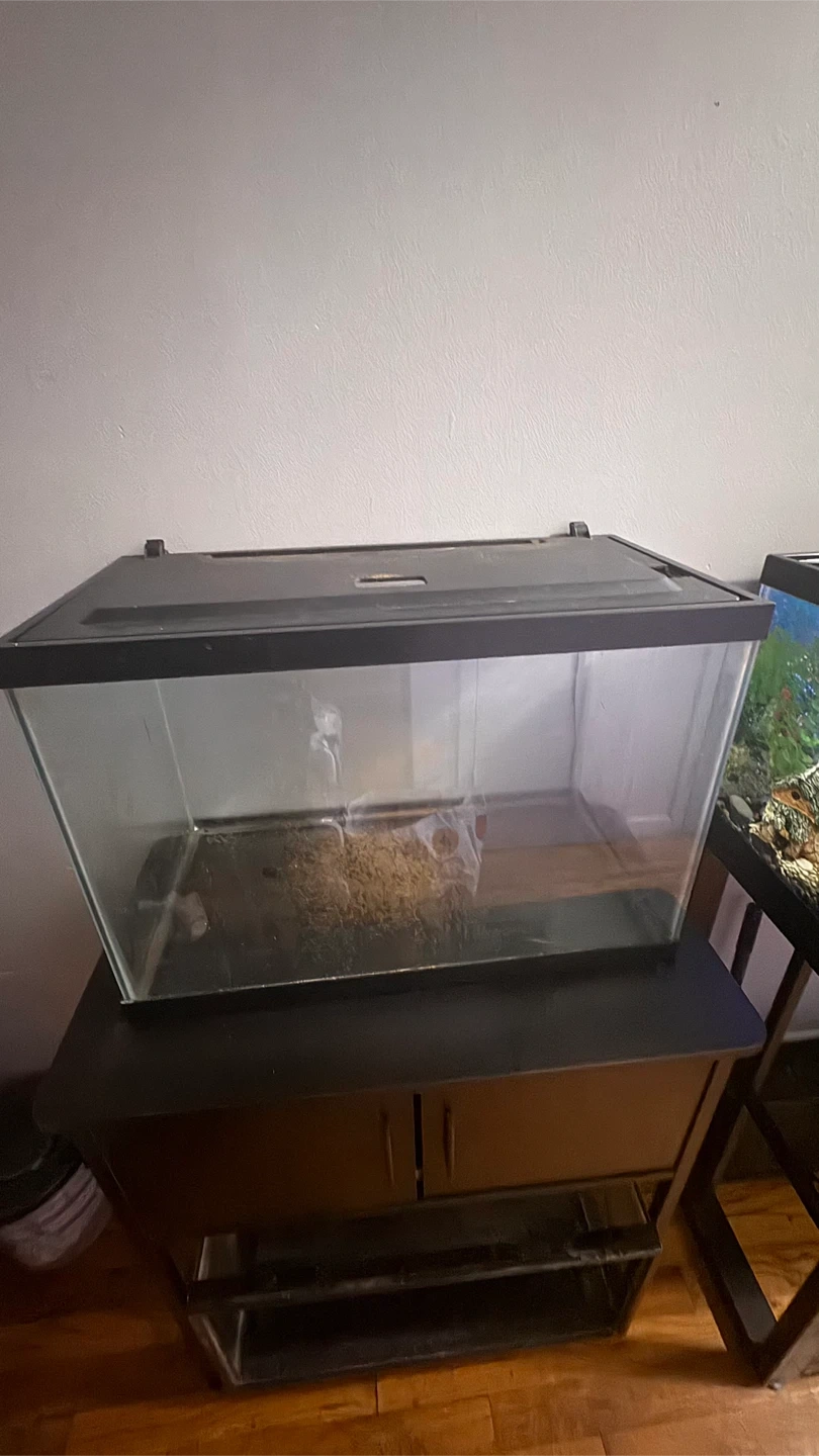 This is a glass aquarium tank and stand. It's a great setup for fish or other small aquatic pets. The tank is made of glass with a black plastic lid.