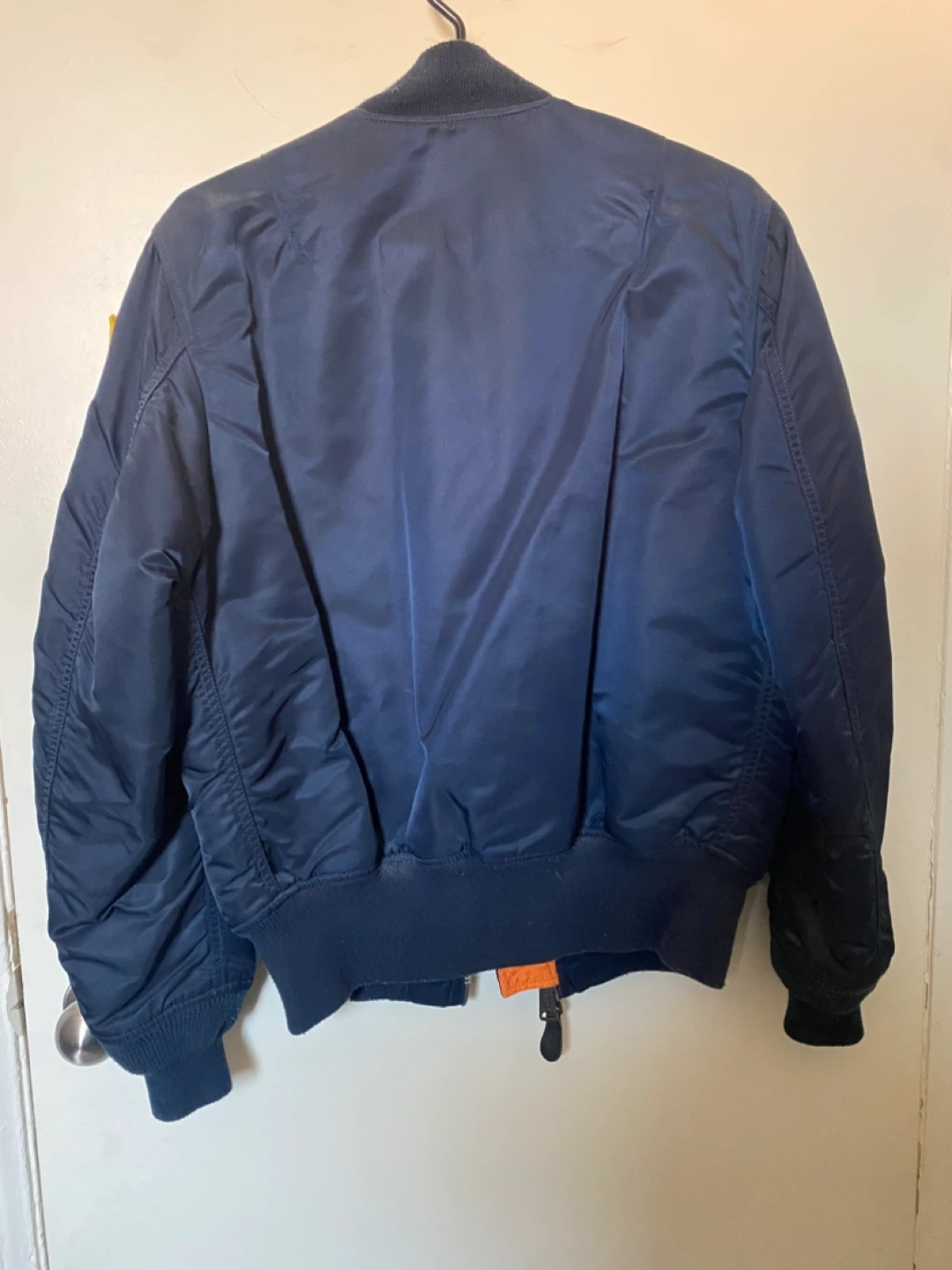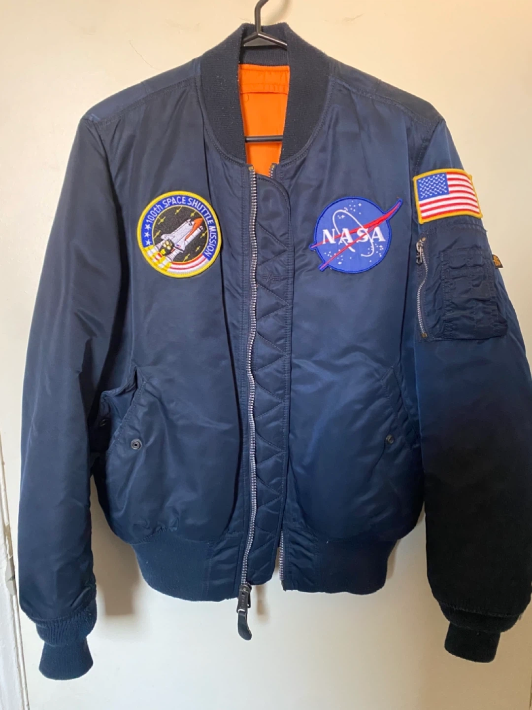 This is an Alpha Industries MA-1 bomber jacket. It's navy blue with an orange lining and features NASA and Space Shuttle mission patches. It does not have the red “Alpha Industries” tag that was attached to the arm.