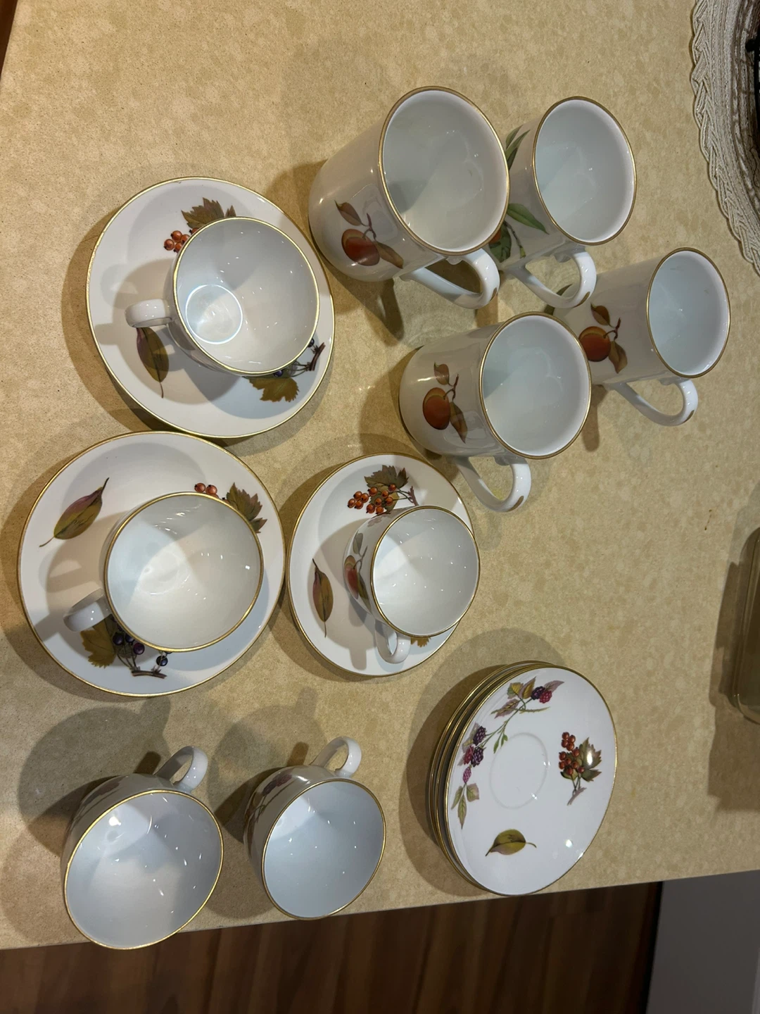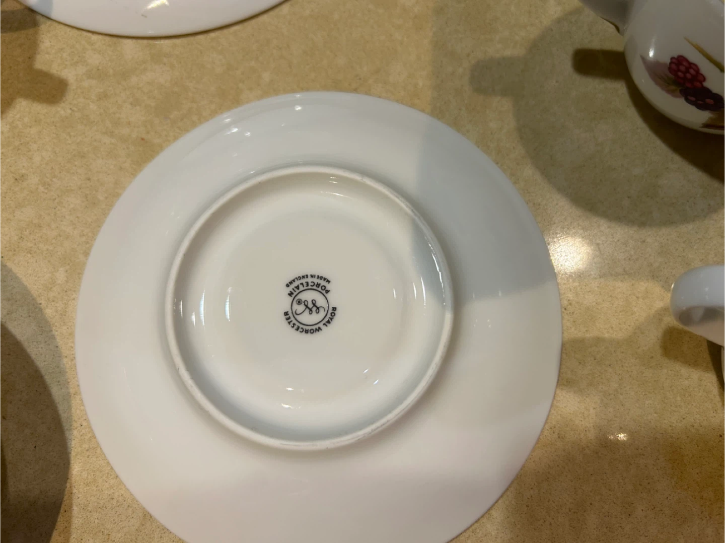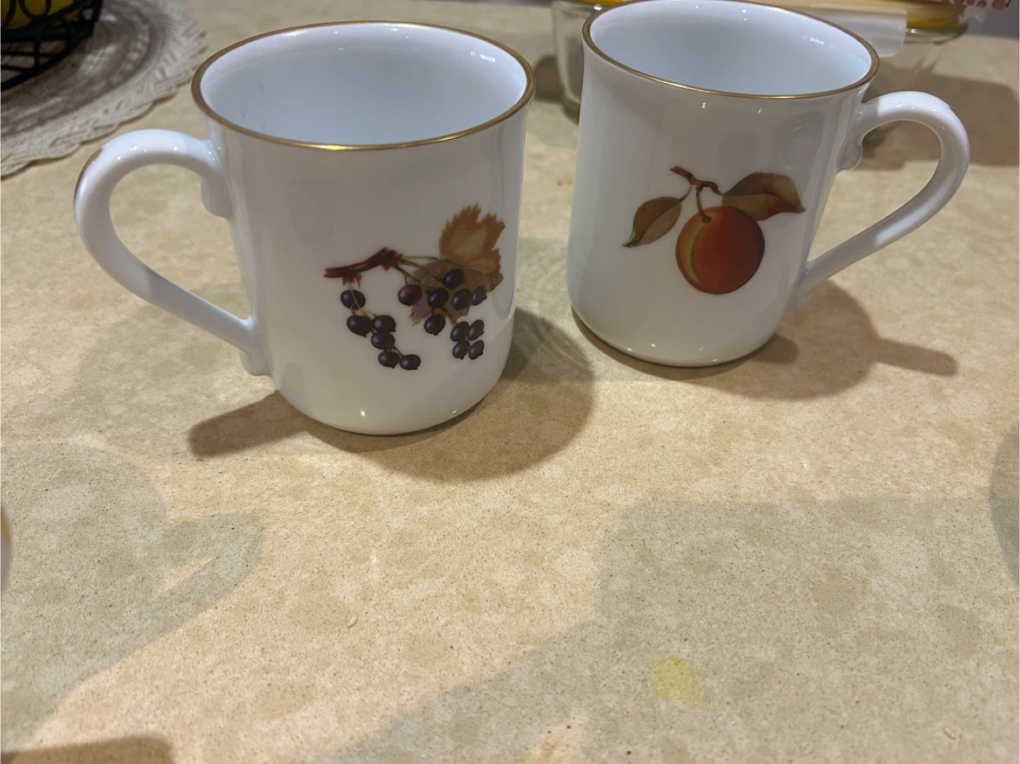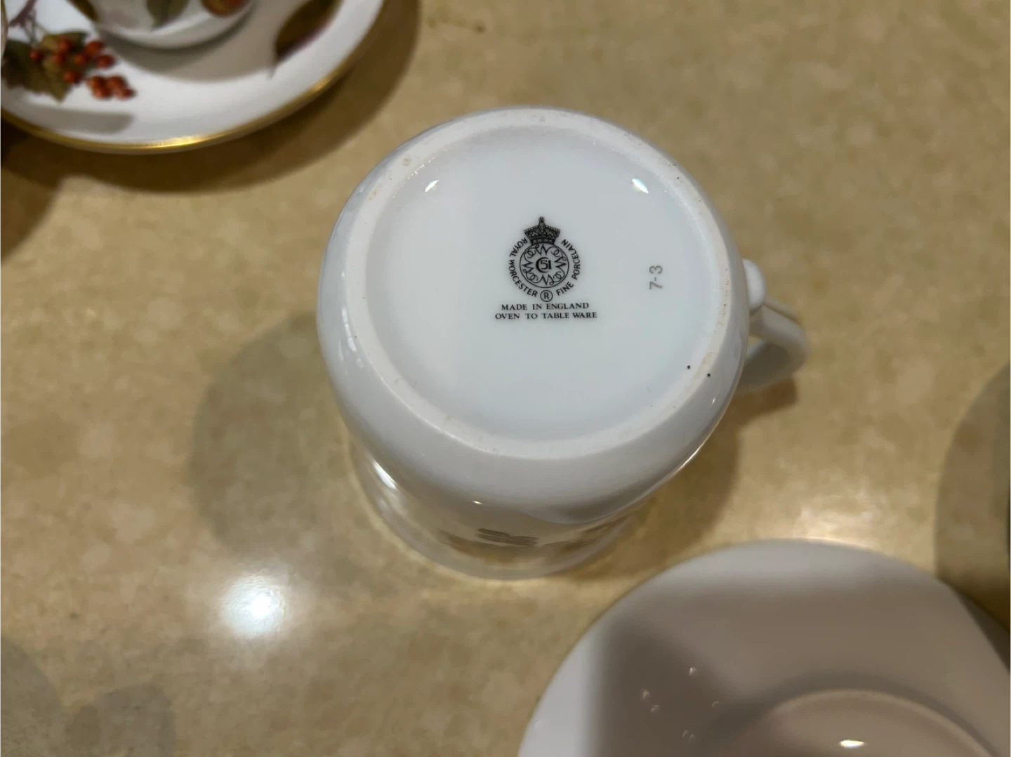 of teacups and saucers featuring fruit and berry designs. Porcelain with gold trim. Dishwasher safe and oven to table ware.