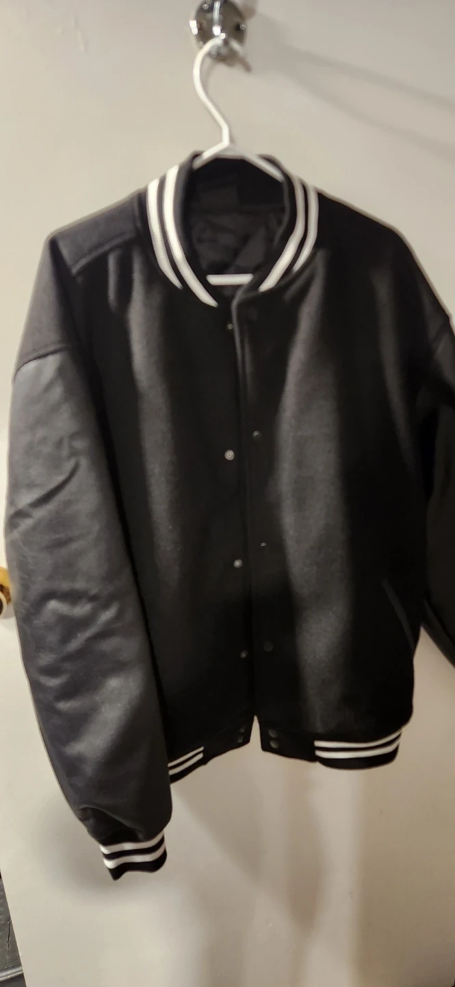 This is a black CSG varsity jacket in size XL/TG. It features faux leather sleeves and a snap button closure. The ribbed collar, cuffs, and hem have white stripe detailing. Brand new without the tags.