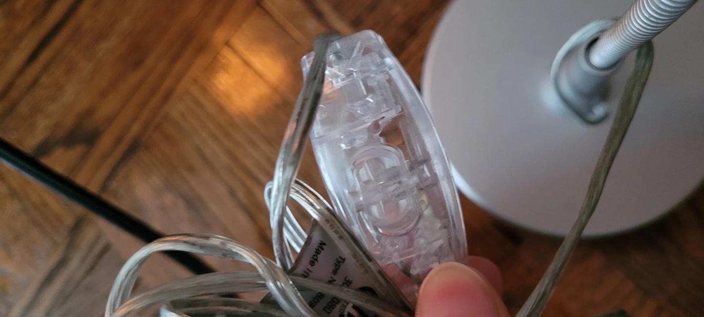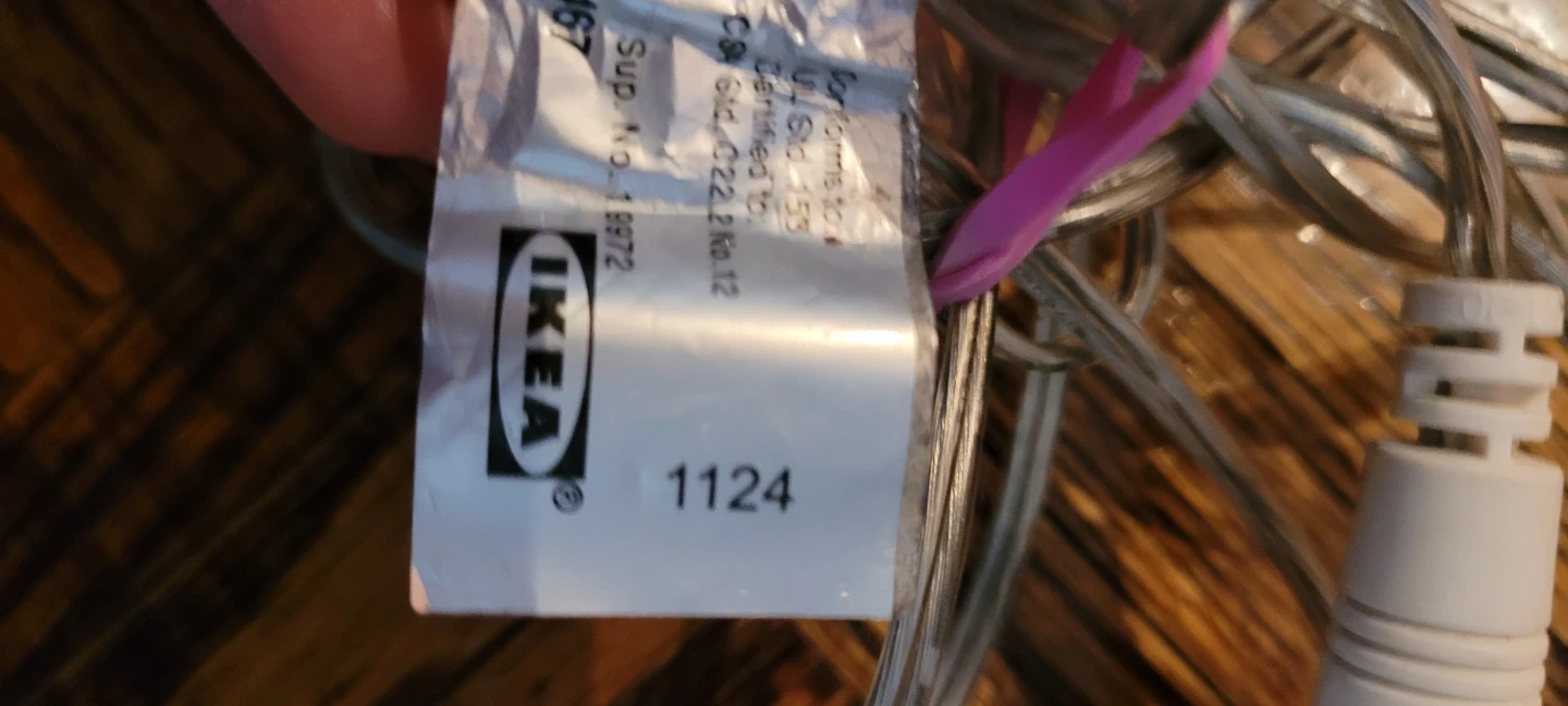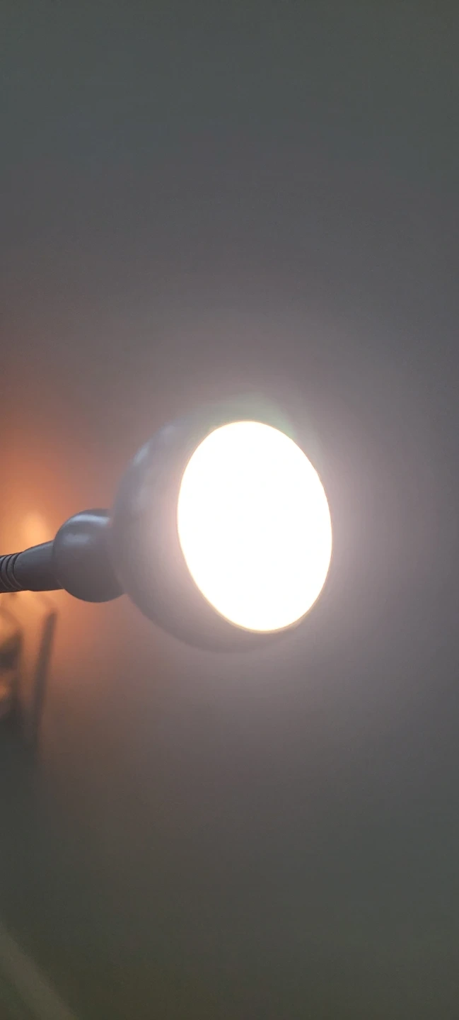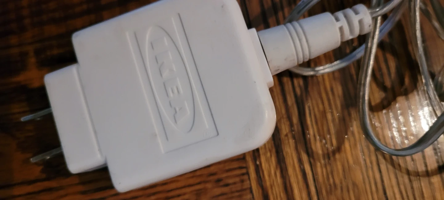 This is an IKEA adjustable desk lamp. It's silver with a flexible neck and includes the power adapter.