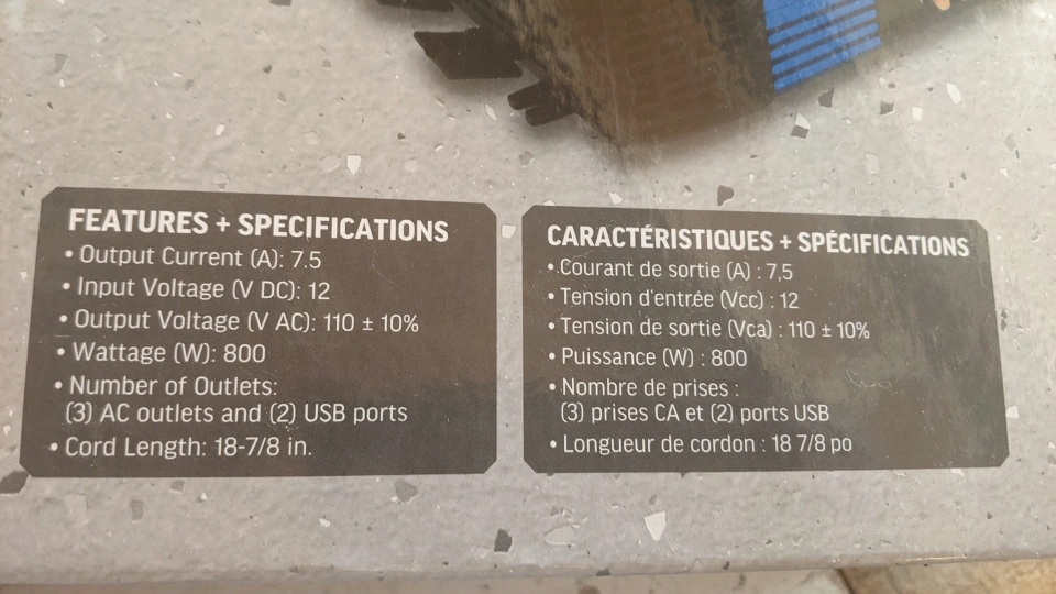 800 watt power inverter. It has 3 AC outlets and 2 USB ports. It is 18 7/8 inches long.