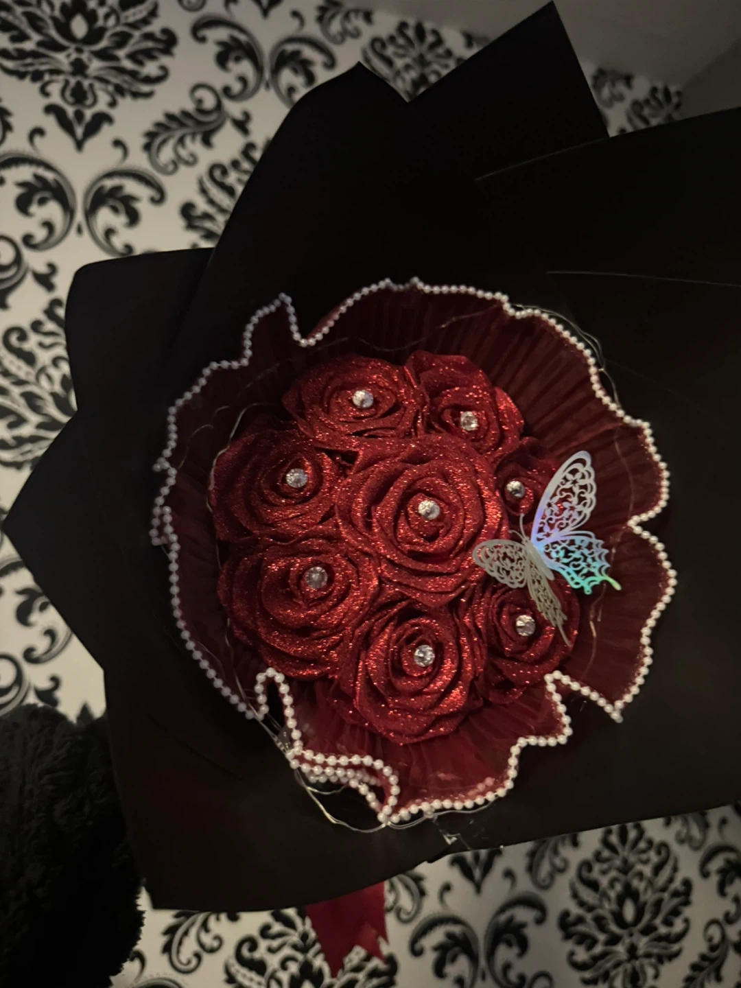 A lovely bouquet featuring sparkly red rose blooms, each adorned with a faux diamond. It's finished with a decorative butterfly and pearl trim, all wrapped in black paper with a red ribbon. This bouquet makes a nice decorative piece for any occasion.