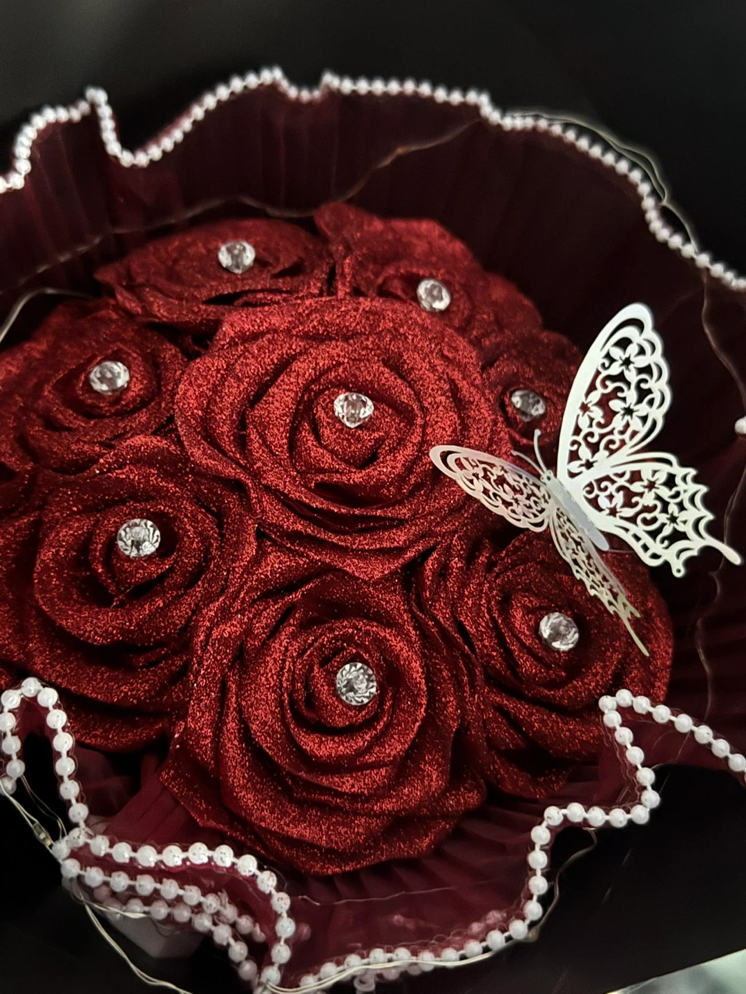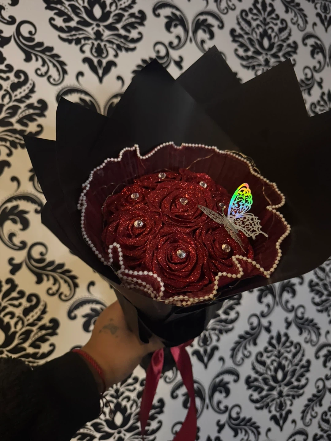 A lovely bouquet featuring sparkly red rose blooms, each adorned with a faux diamond. It's finished with a decorative butterfly and pearl trim, all wrapped in black paper with a red ribbon. This bouquet makes a nice decorative piece for any occasion.