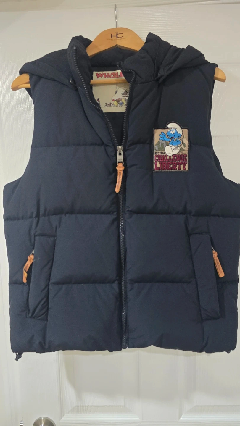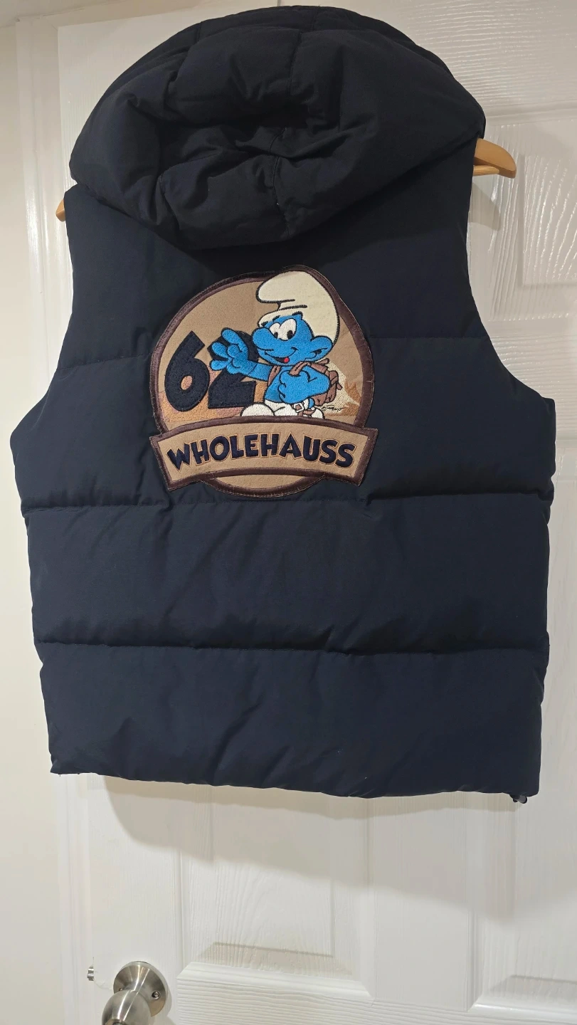 Here's a WHOLEHAUSS padded vest featuring a Smurf design! It's in great condition and ready for a new owner. Perfect for adding a bit of fun to your outfit!