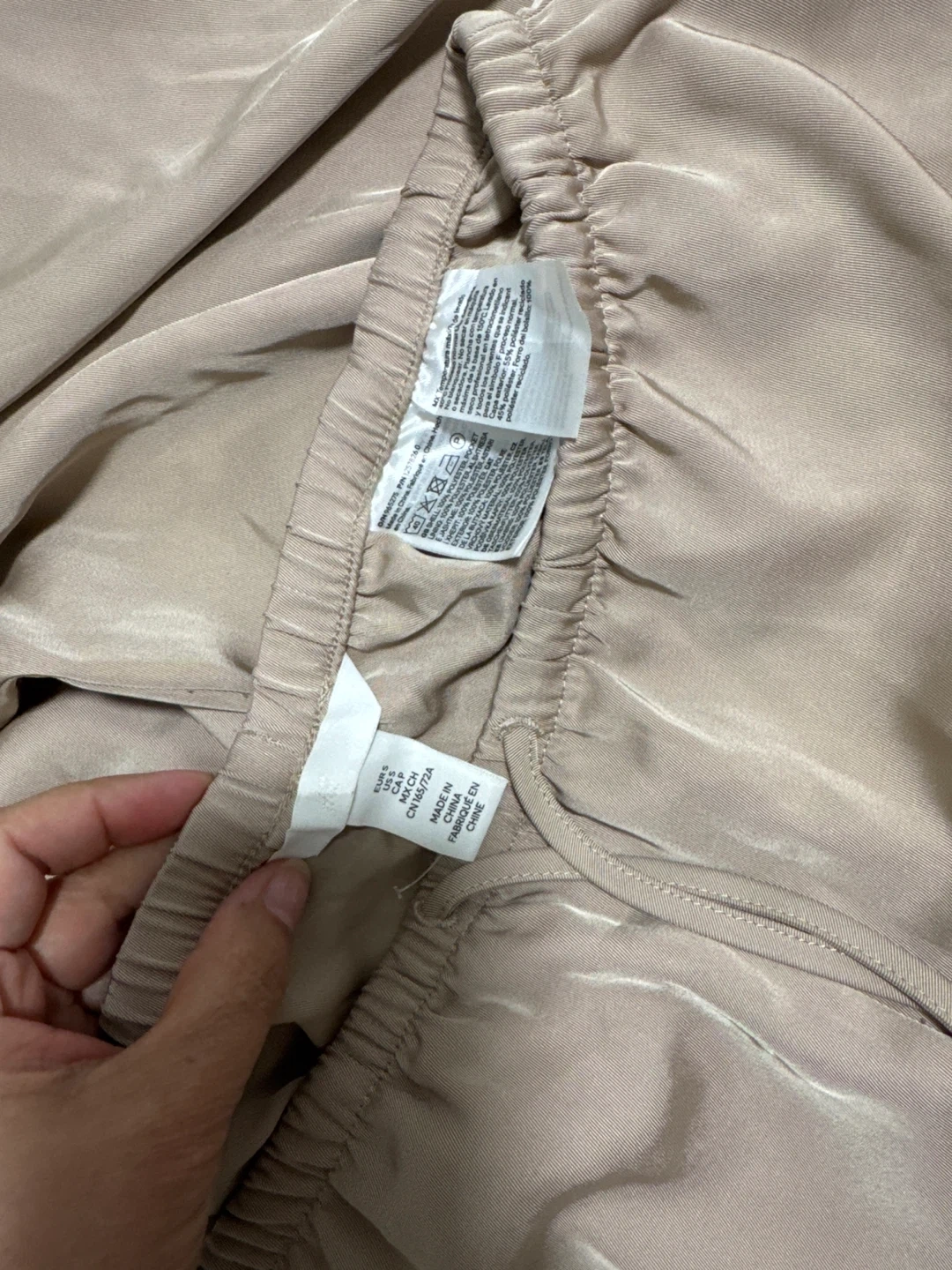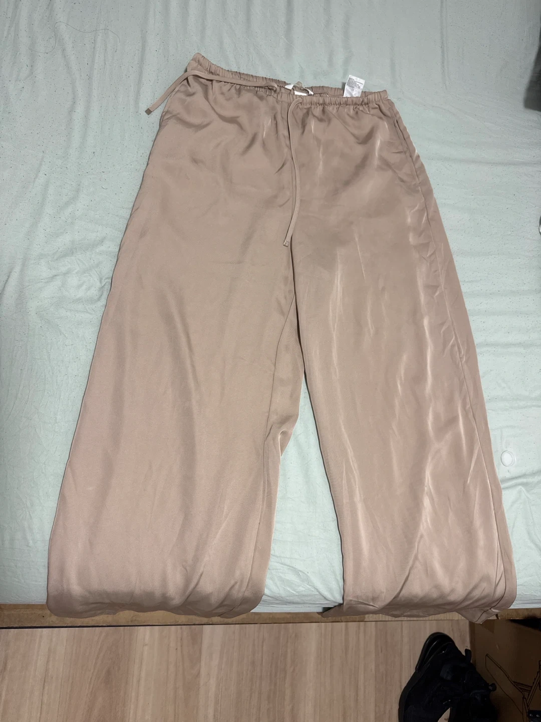 Lightweight wide leg satin pants. Elastic waistband with drawstring. Side pockets. Made in China. Polyester material.
