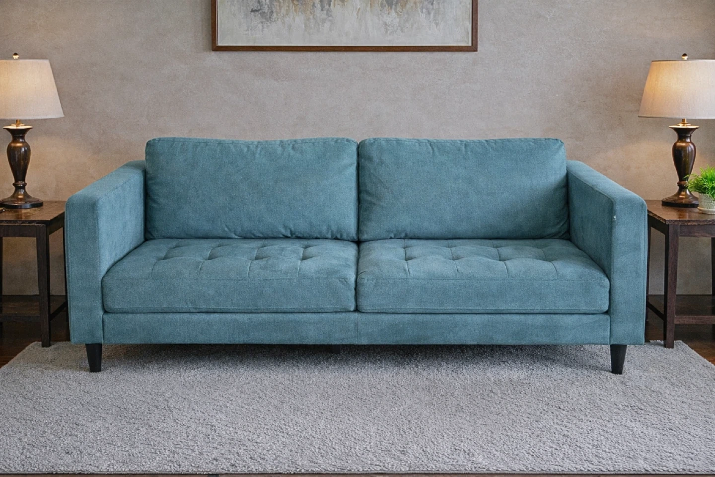 Modern two-seater sofa with tufted detailing. It's upholstered in a durable fabric. Perfect for a living room or smaller apartment.