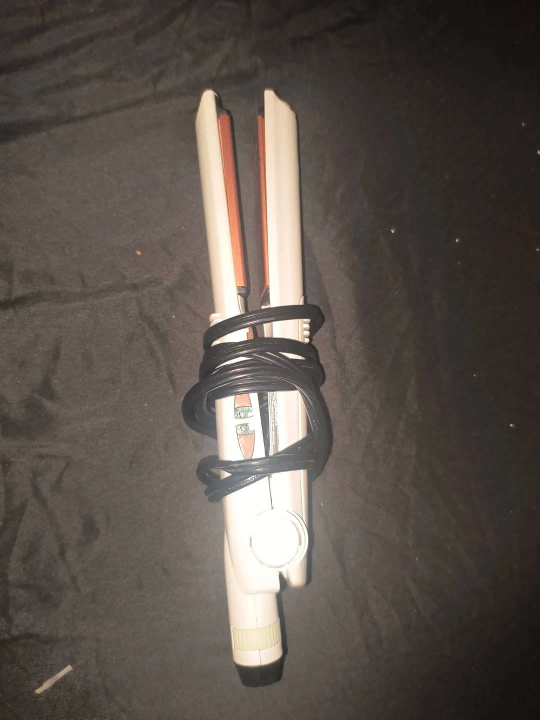 This is a white hair straightener with orange ceramic plates. It has a dial for temperature adjustment and a cord for power. It's suitable for straightening hair.
