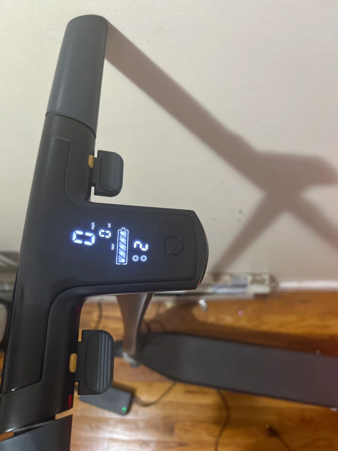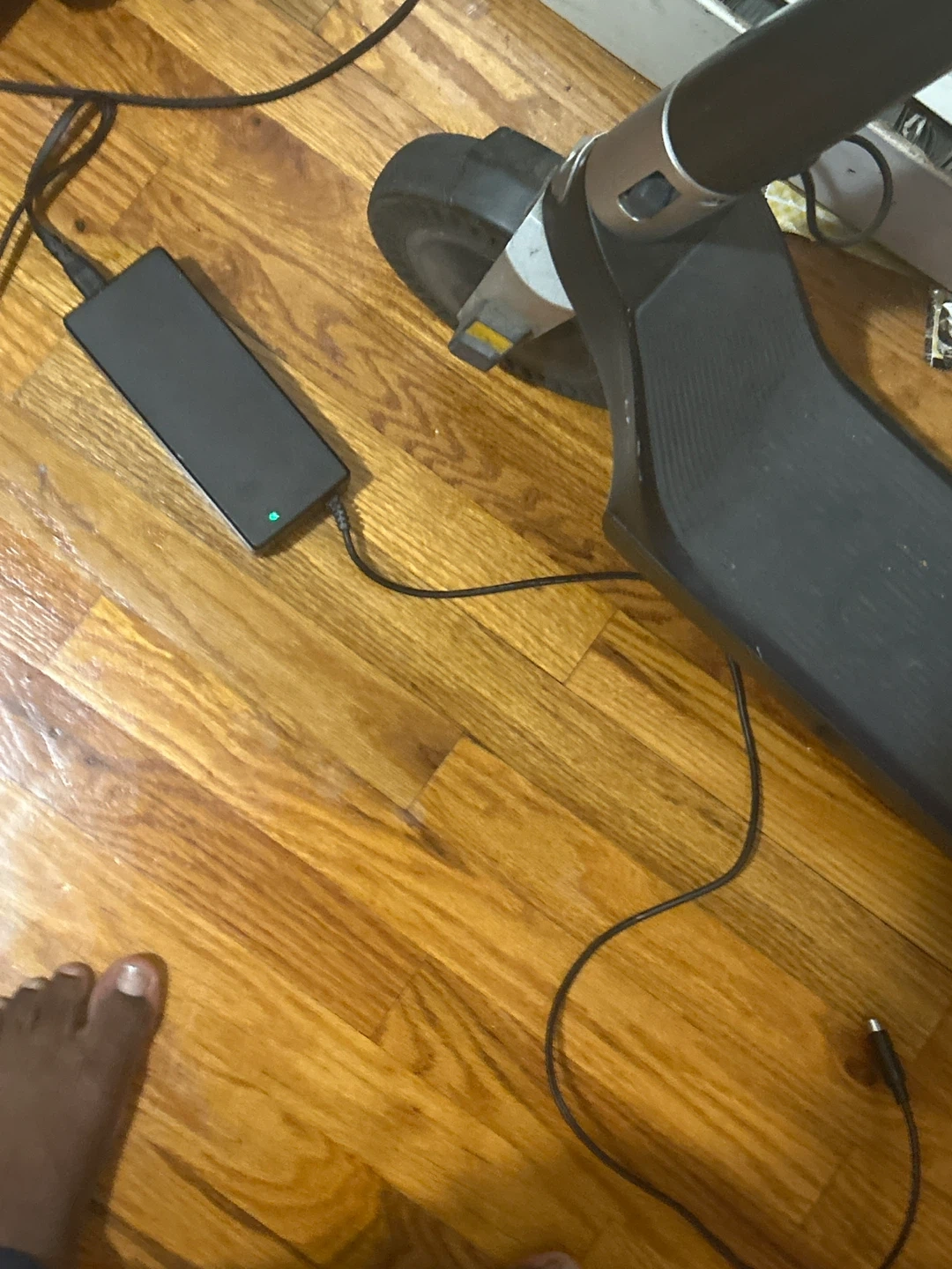 This electric scooter is black with a digital display showing speed and battery life. It comes with its original charger. The scooter has a bright red tail light for visibility. Ready for your commute!