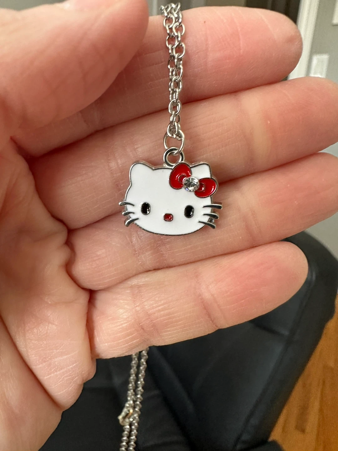 A cute Hello Kitty pendant necklace with a silver-tone chain. Features the iconic Hello Kitty face with a red bow accent. Perfect for any fan!