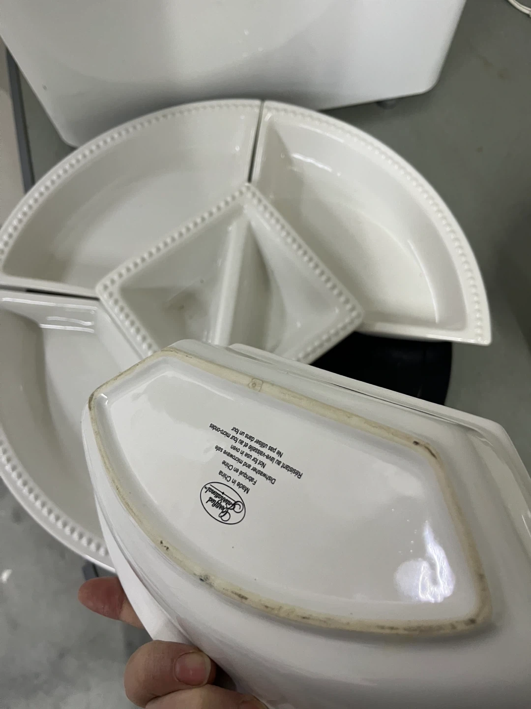Selling a Certified International divided serving dish. It's a great way to serve snacks or appetizers. The dish is white and has a beaded design around the edges. It's in good condition and ready for a new home