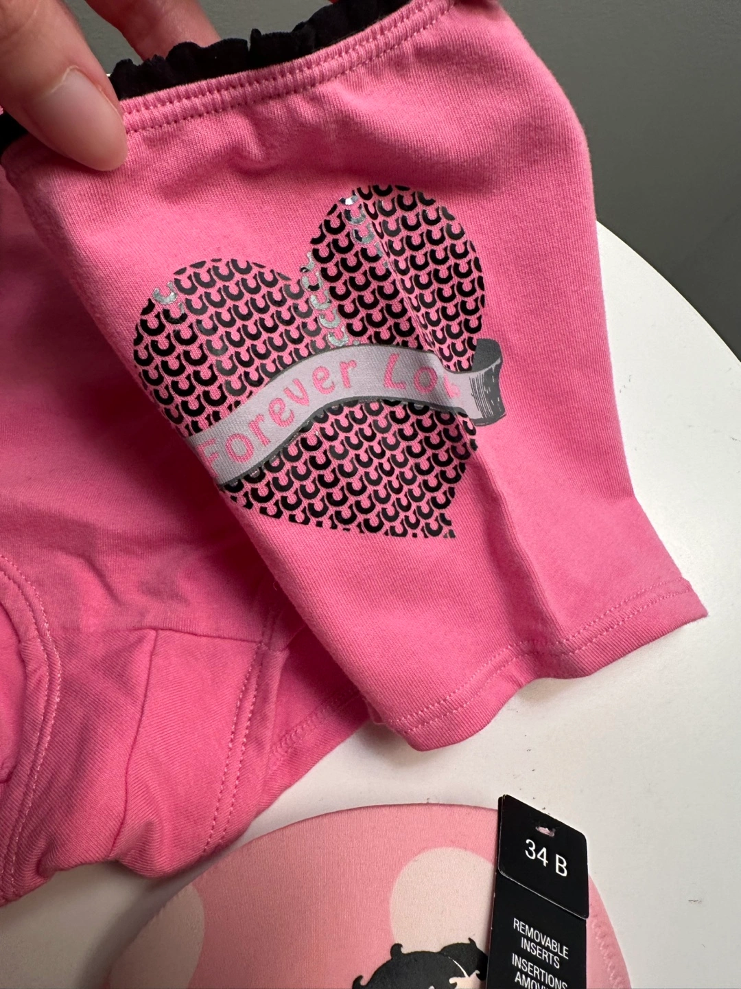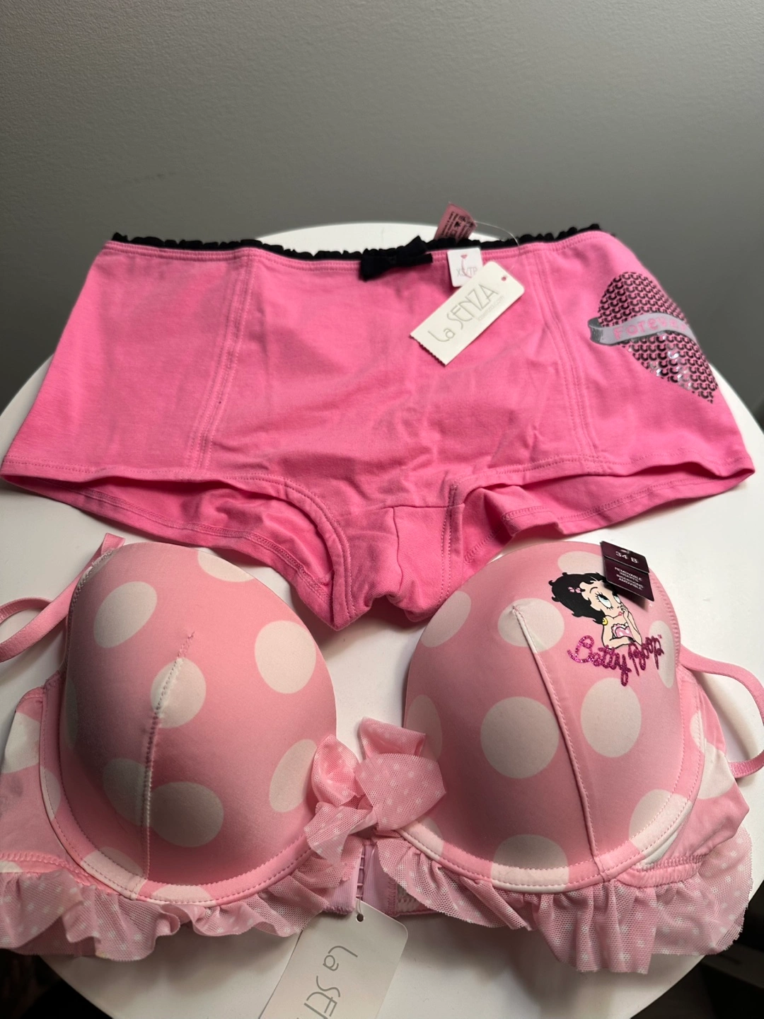 Brand new La Senza bra and panty set. Pink polka dot design. Features Bettie Page artwork. Size 34B & XS. Comes in Holt Renfrew box.