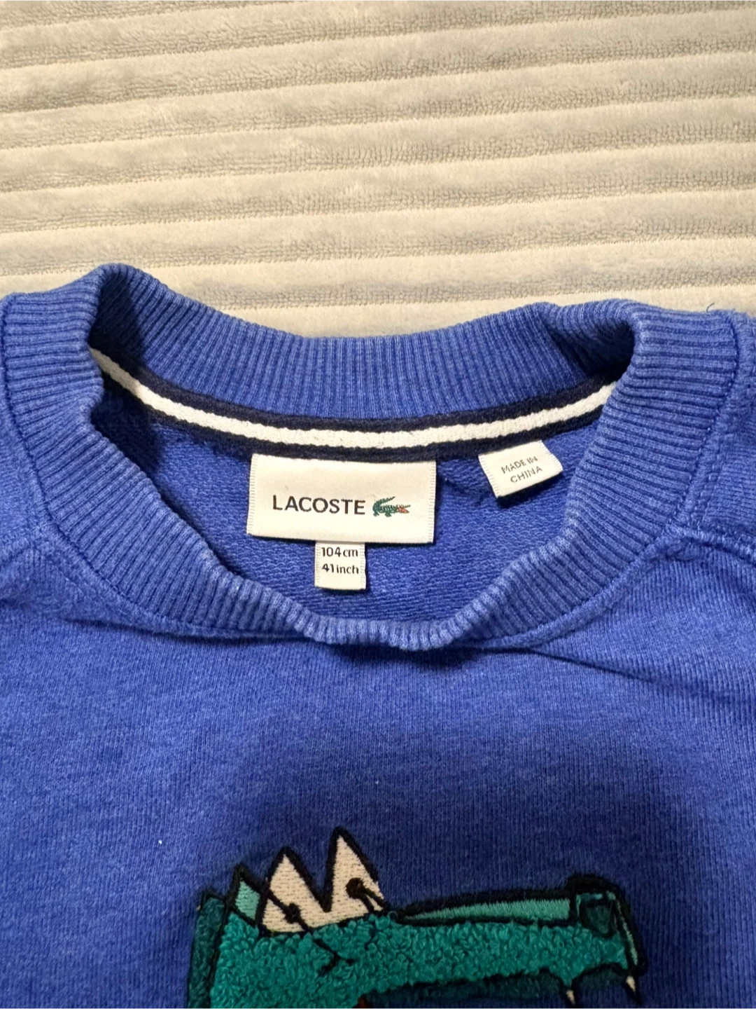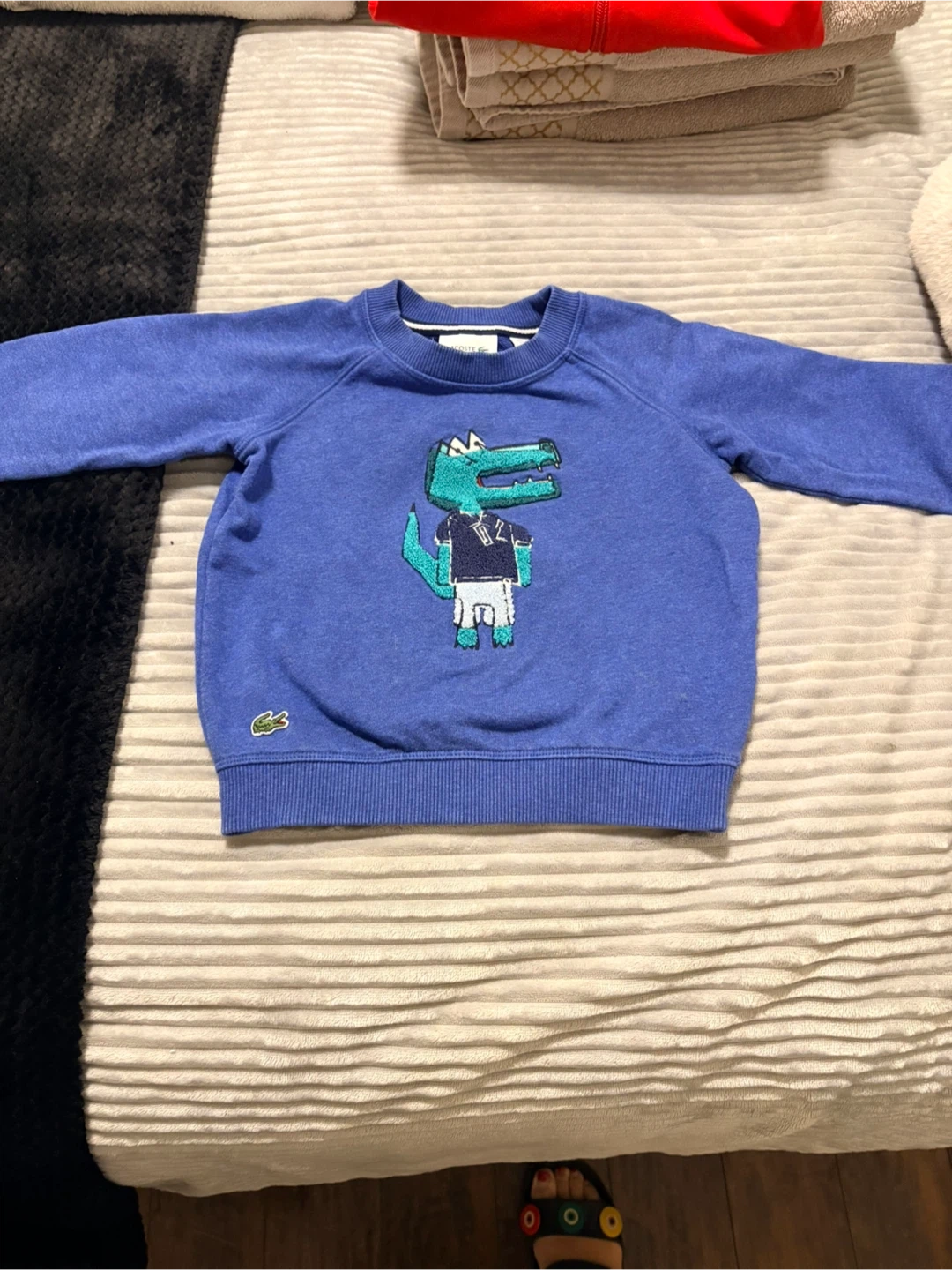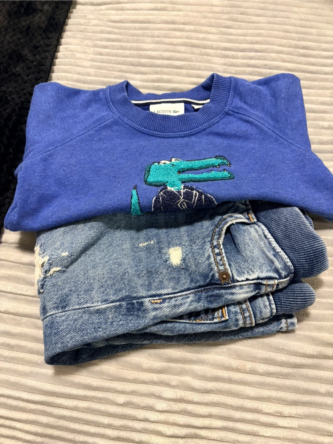 Selling a cute set for kids! Includes a Lacoste sweater with a fun crocodile design, size 104cm (41 inch). Also comes with a pair of gap jeans. Both in great condition and ready for a new home!