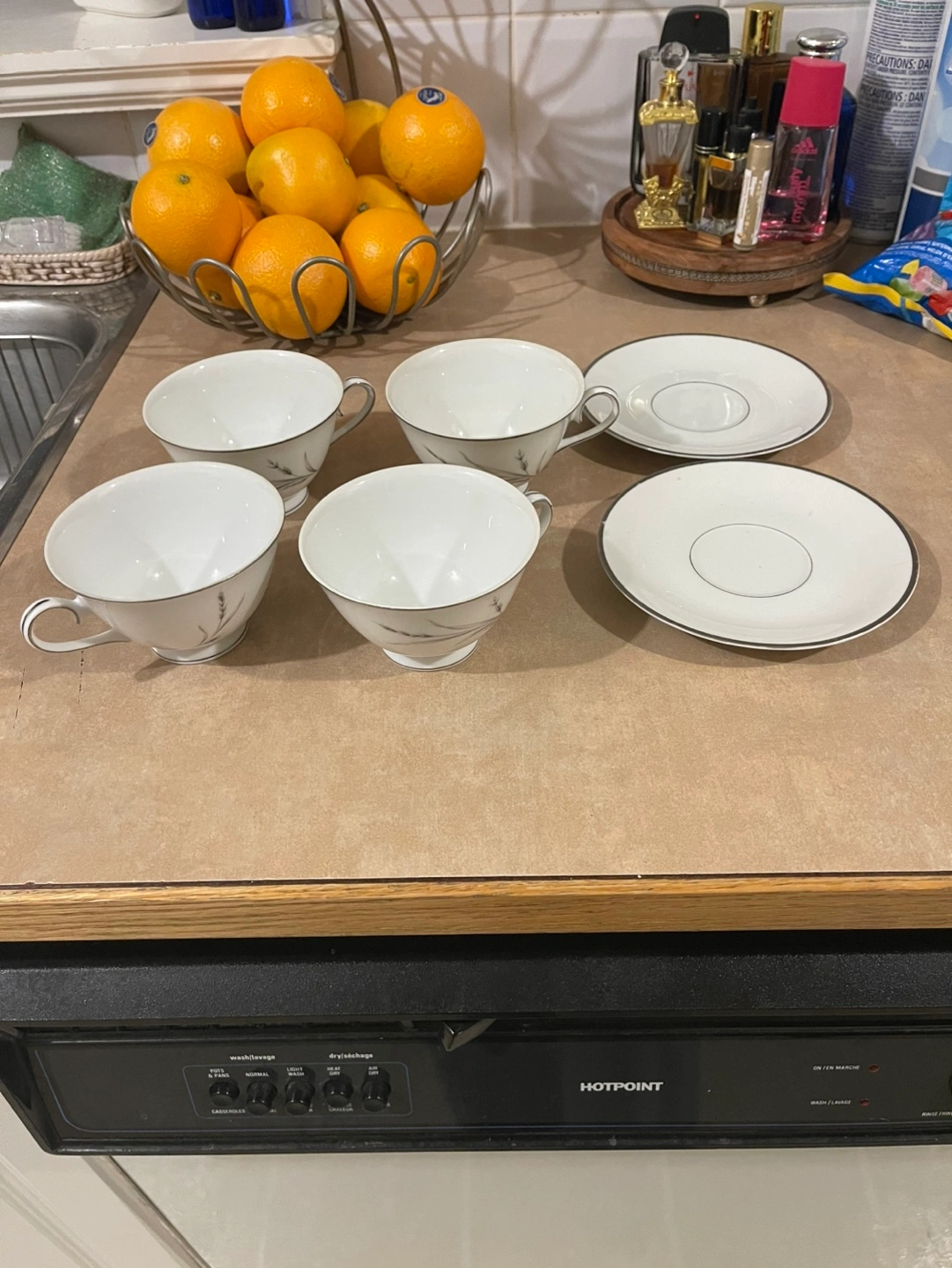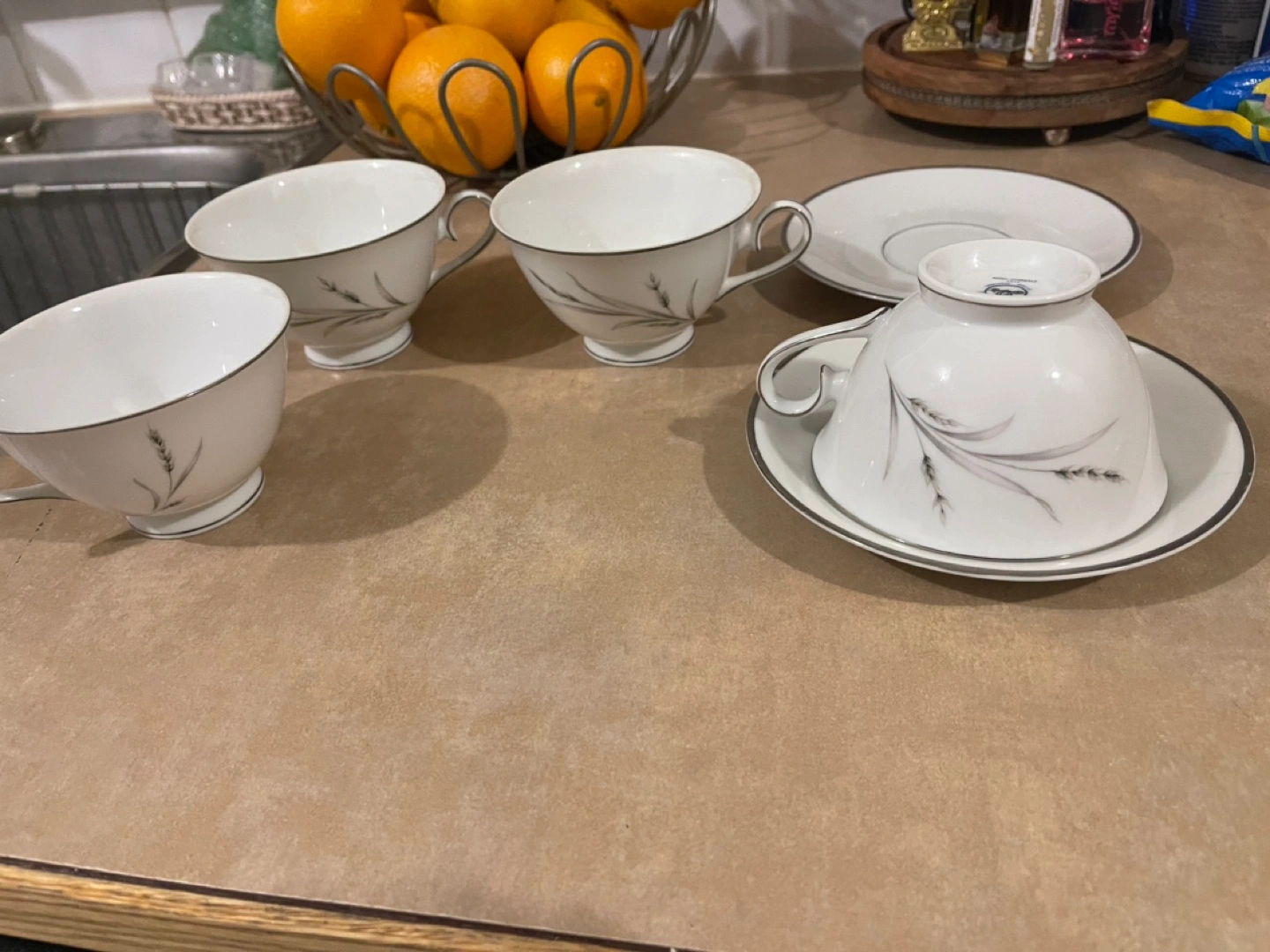 π₯π ππ± Set of four vintage teacups and saucers. Elegant design. Wheat pattern. Silver trim. Pre-owned.