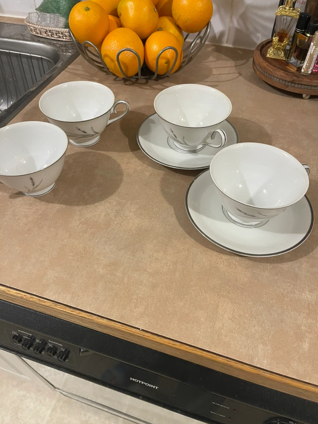 π₯π ππ± Set of four vintage teacups and saucers. Elegant design. Wheat pattern. Silver trim. Pre-owned.