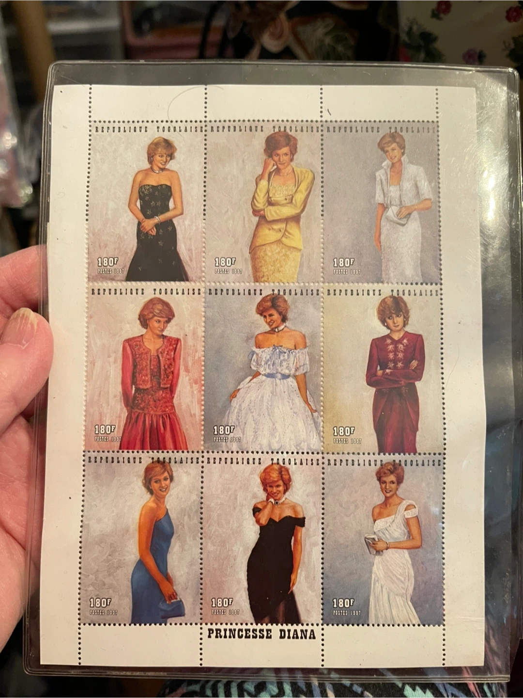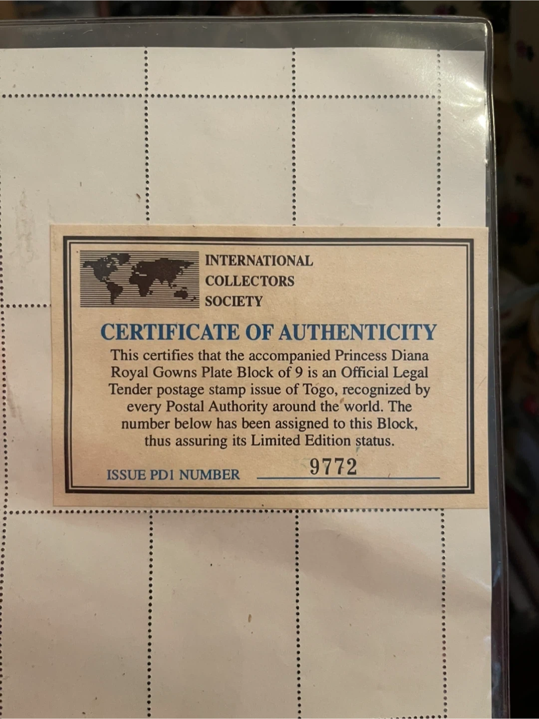 This is a plate block of 9 official legal tender postage stamps featuring Princess Diana's royal gowns, from Togo. It's an official legal tender issue. This block is officially recognized by every postal authority around the world, assuring its limited edition status. The issue number is PD1 9772.