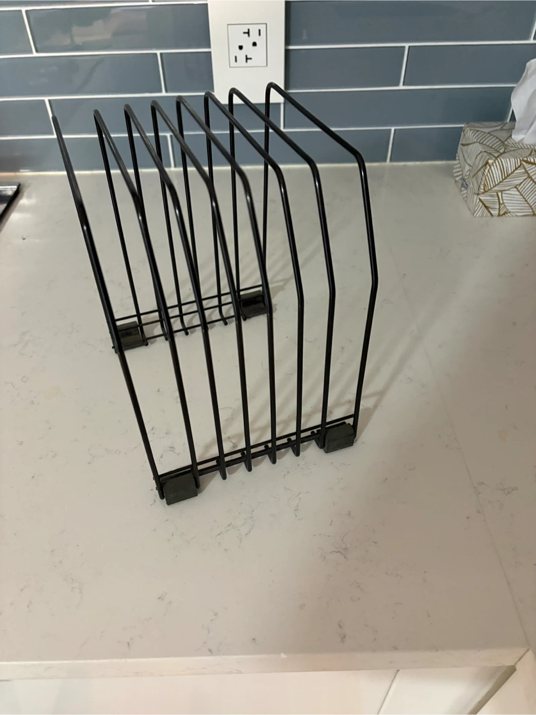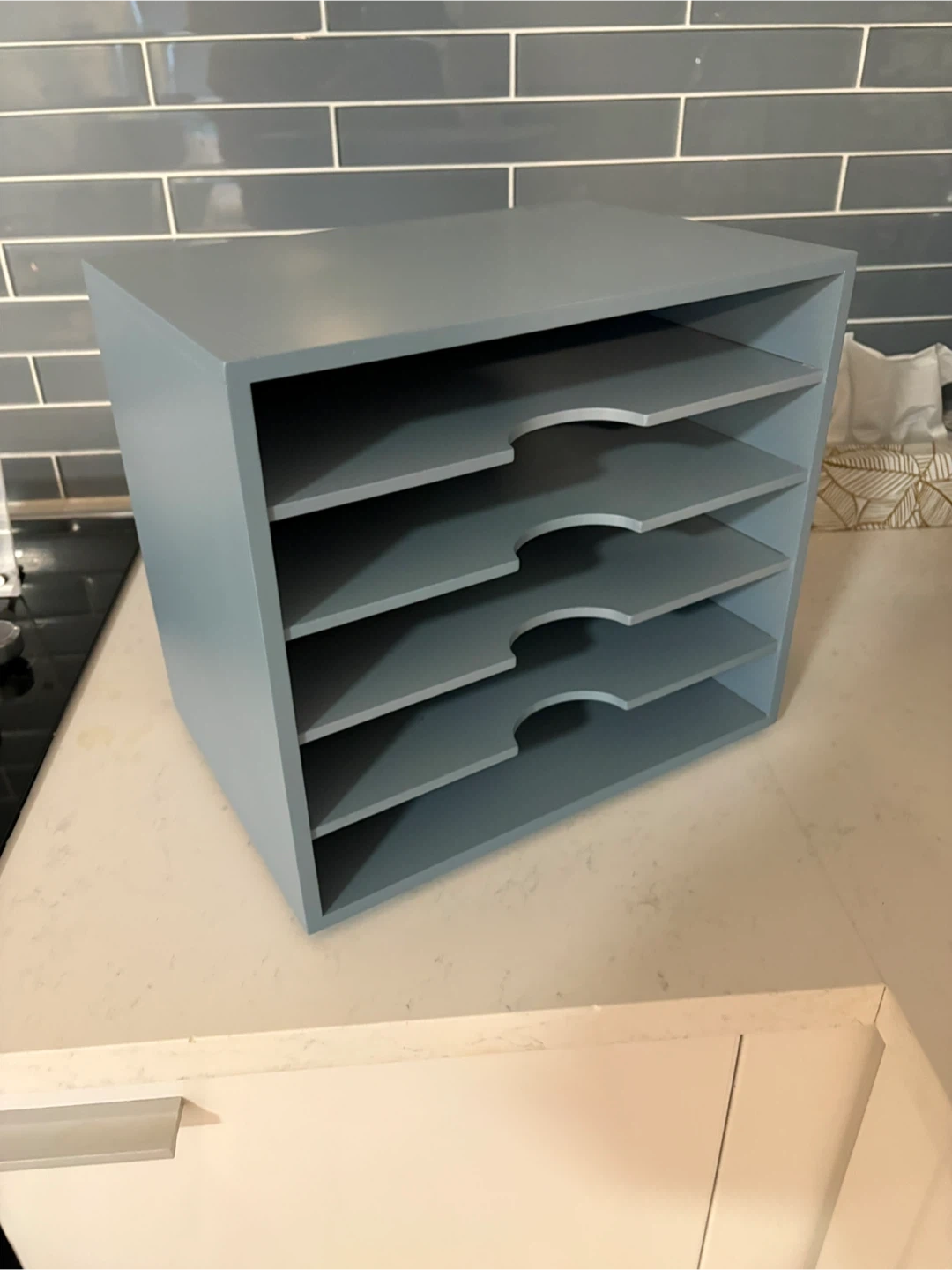 This set includes a black metal file sorter and a light blue wooden desk organizer with four shelves. The organizer helps keep papers and files tidy. It's suitable for organizing mail or documents on a desk.