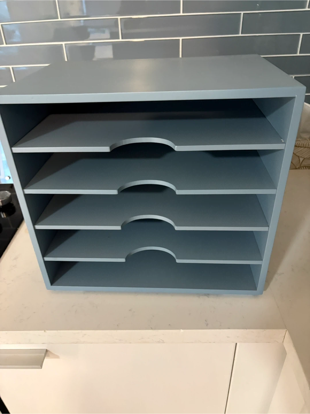 This set includes a black metal file sorter and a light blue wooden desk organizer with four shelves. The organizer helps keep papers and files tidy. It's suitable for organizing mail or documents on a desk.