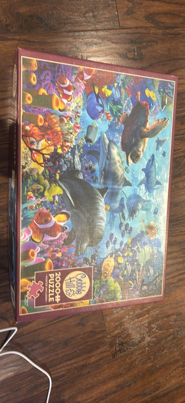Dive into an underwater adventure with this used Cobble Hill 2000-piece jigsaw puzzle! This vibrant puzzle is perfect for puzzle enthusiasts who enjoy a challenge and love marine life. The puzzle, when completed, showcases a colourful ocean scene filled with dolphins, sea turtles, and coral reefs.