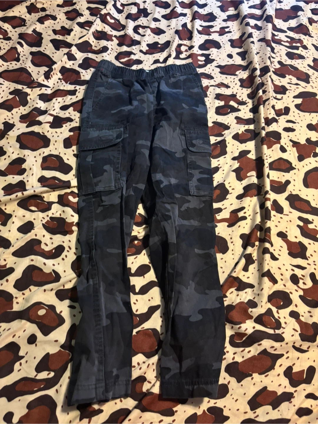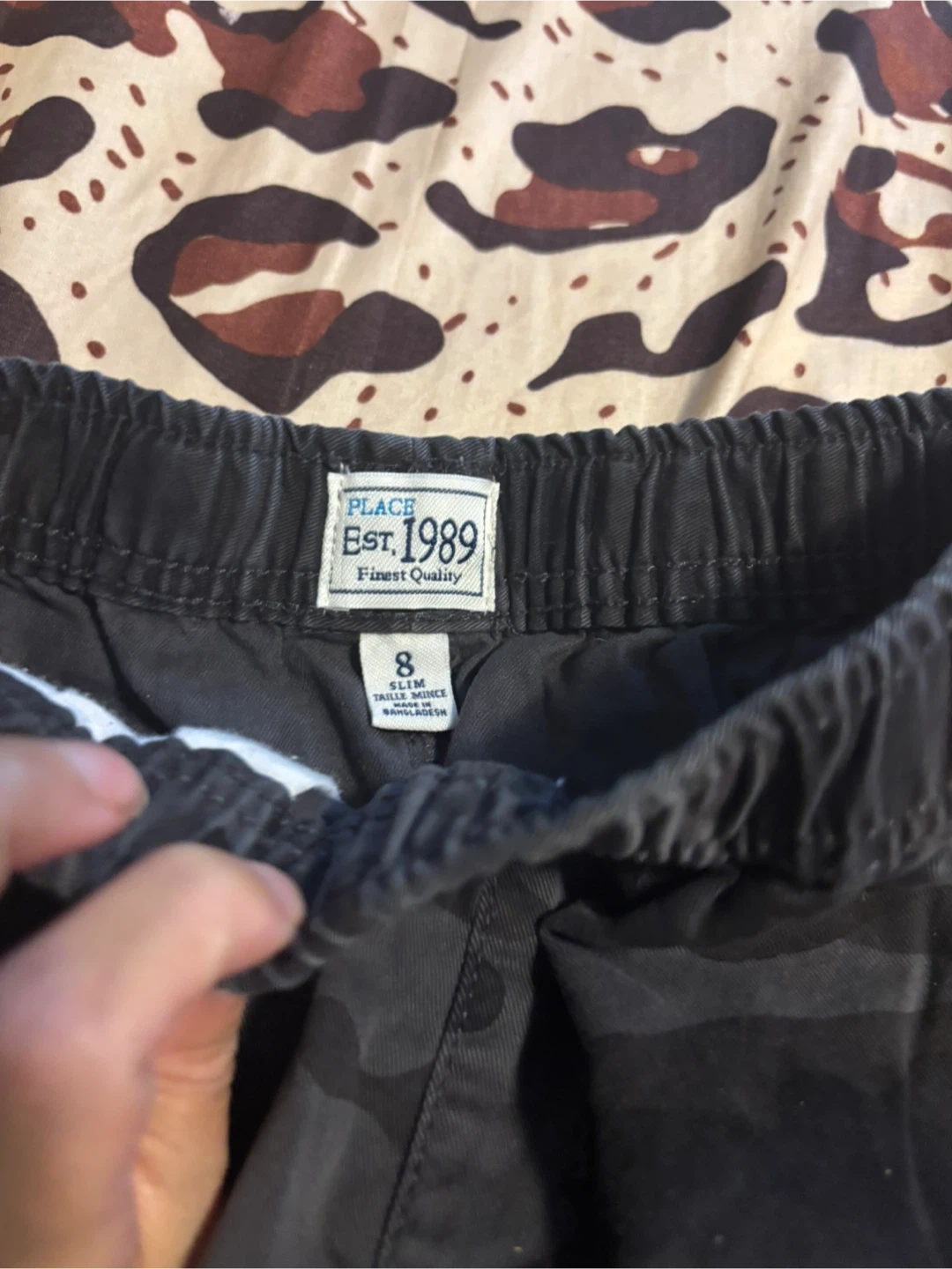 These cargo pants are from The Children's Place. They feature a camouflage pattern and elastic waistband. Pants are size 8.