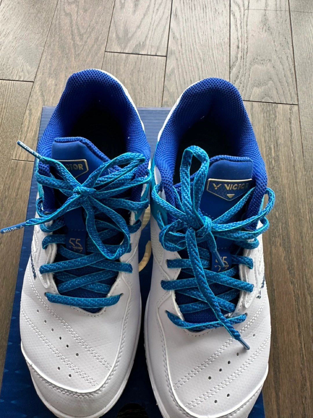 Lightly used Victor badminton shoes. Size EUR 39. White with blue accents. Great condition. Includes original box.