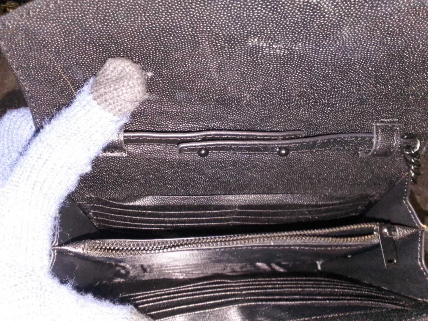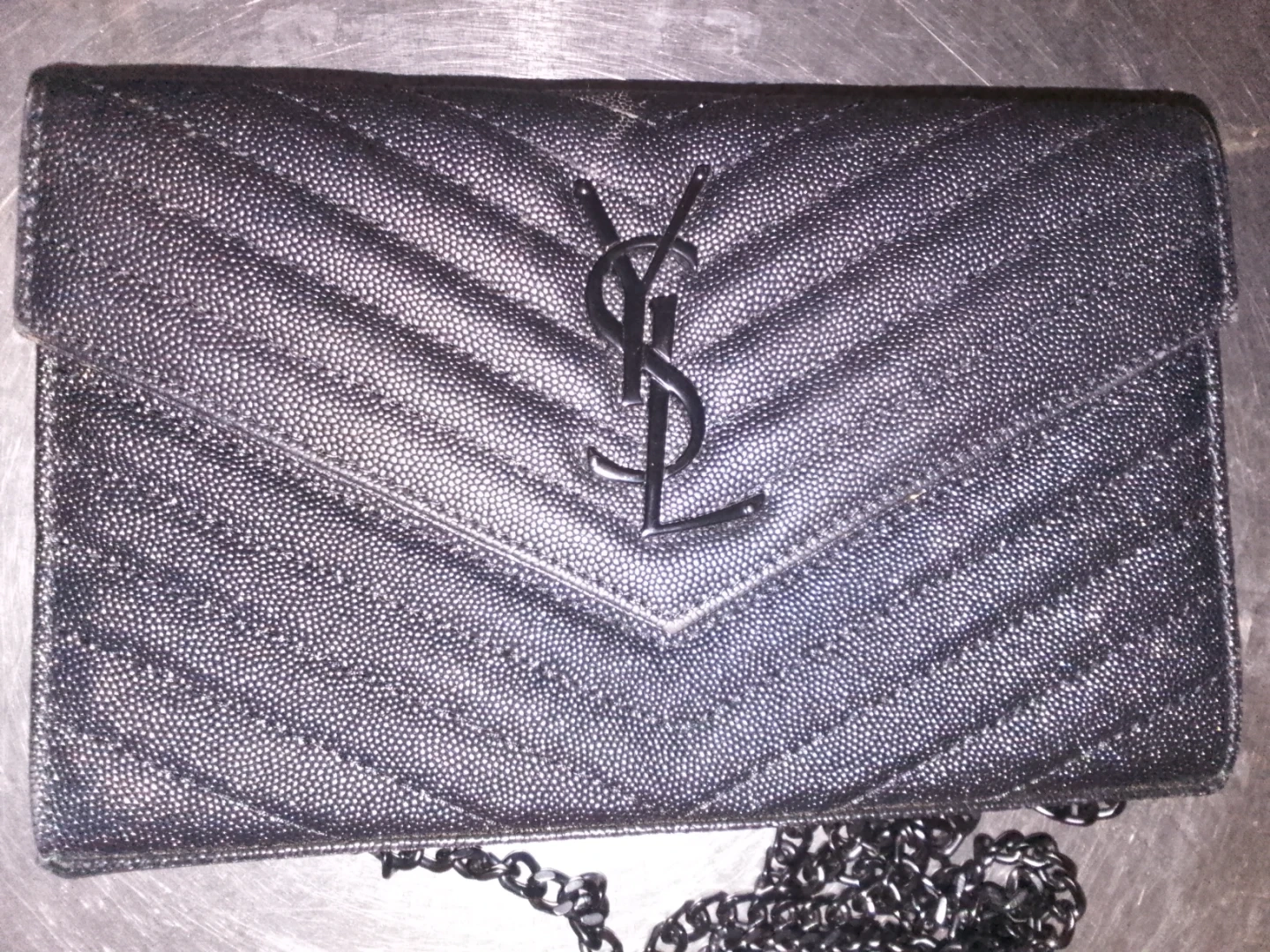 This is a black Saint Laurent small purse on chain crafted from grained leather. It features multiple card slots and a zippered compartment inside. Its quilted pattern and signature YSL logo make it a stylish accessory.