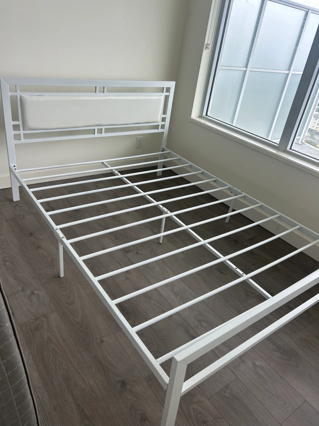 Selling a white metal bed frame that's in great condition. It's sturdy and has a clean, modern look. Perfect for any bedroom!