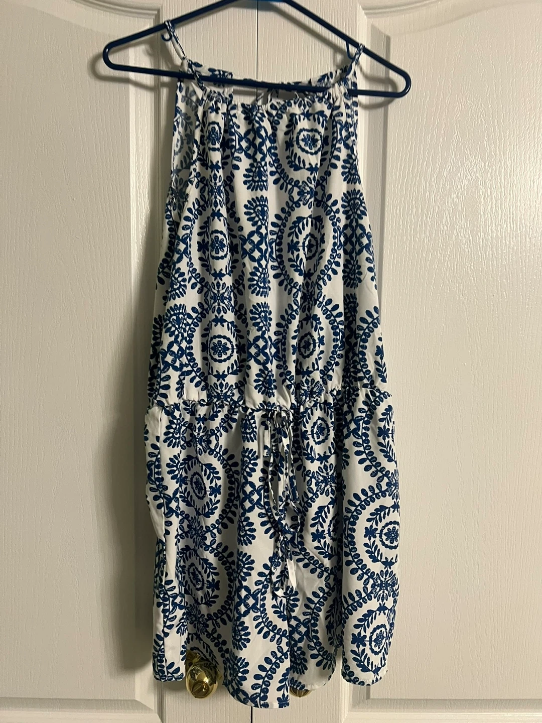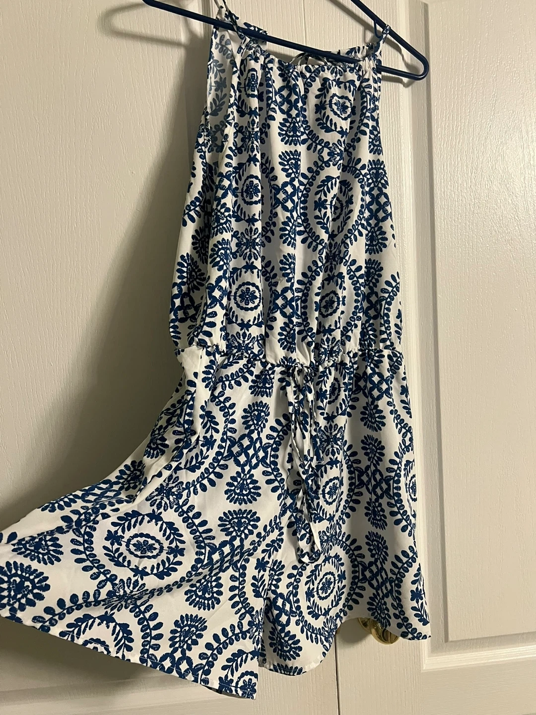 Two sleeveless rompers. One features an orange and white floral pattern with polka dots. The other has a blue and white medallion pattern. Both have adjustable straps and a cinched waist.