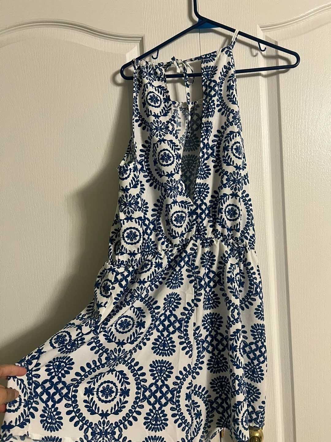 Two sleeveless rompers. One features an orange and white floral pattern with polka dots. The other has a blue and white medallion pattern. Both have adjustable straps and a cinched waist.