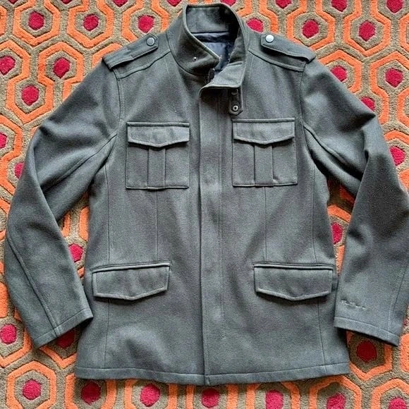 Dark green military style jacket by Ben Sherman. 60% wool. Pre-owned but hardly worn and in excellent condition. Men's Large, but a bit slim fitting. Check measurements in photos. Pick up near Yonge & Sheppard.